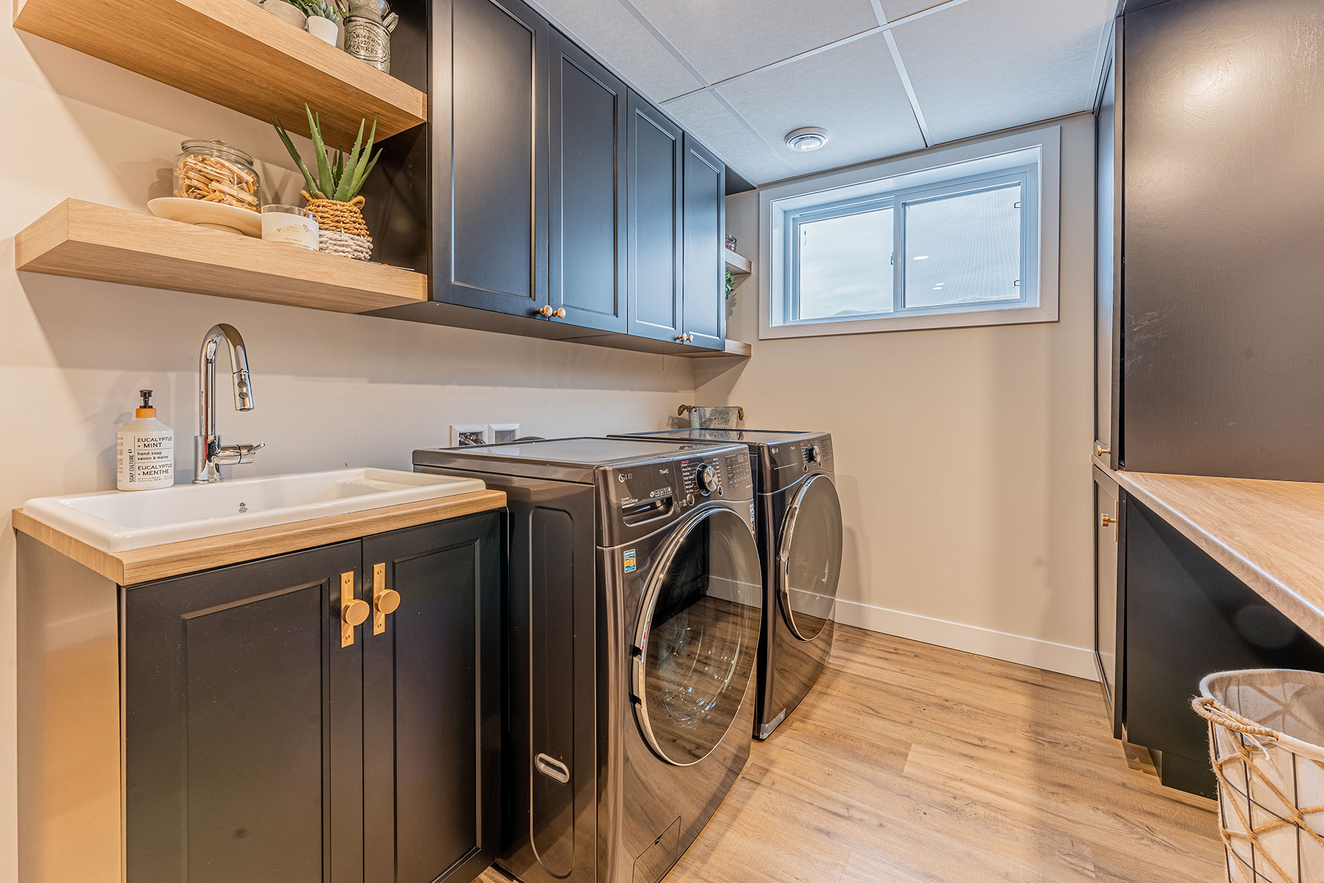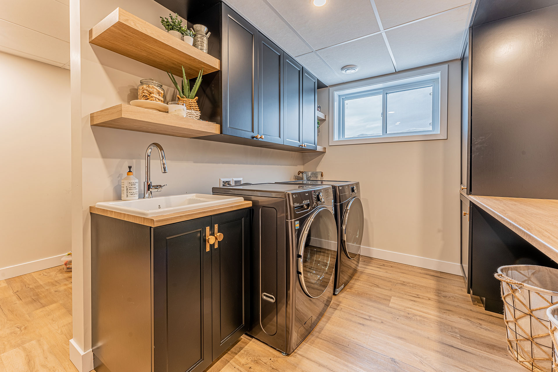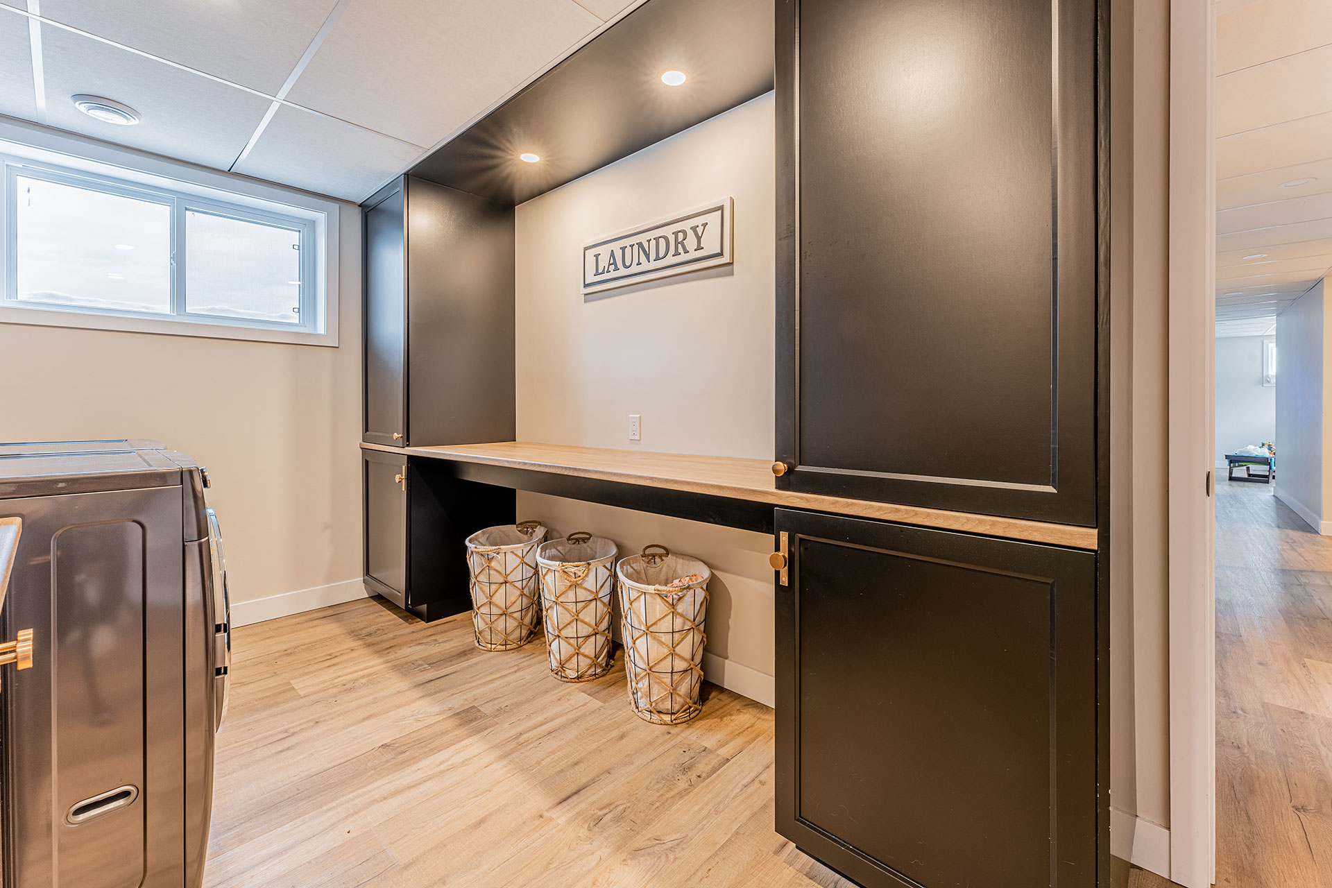 Rangement modulaire pour salle de lavage en merisier laqué noir avec comptoir et tablettes en stratifié effet bois.