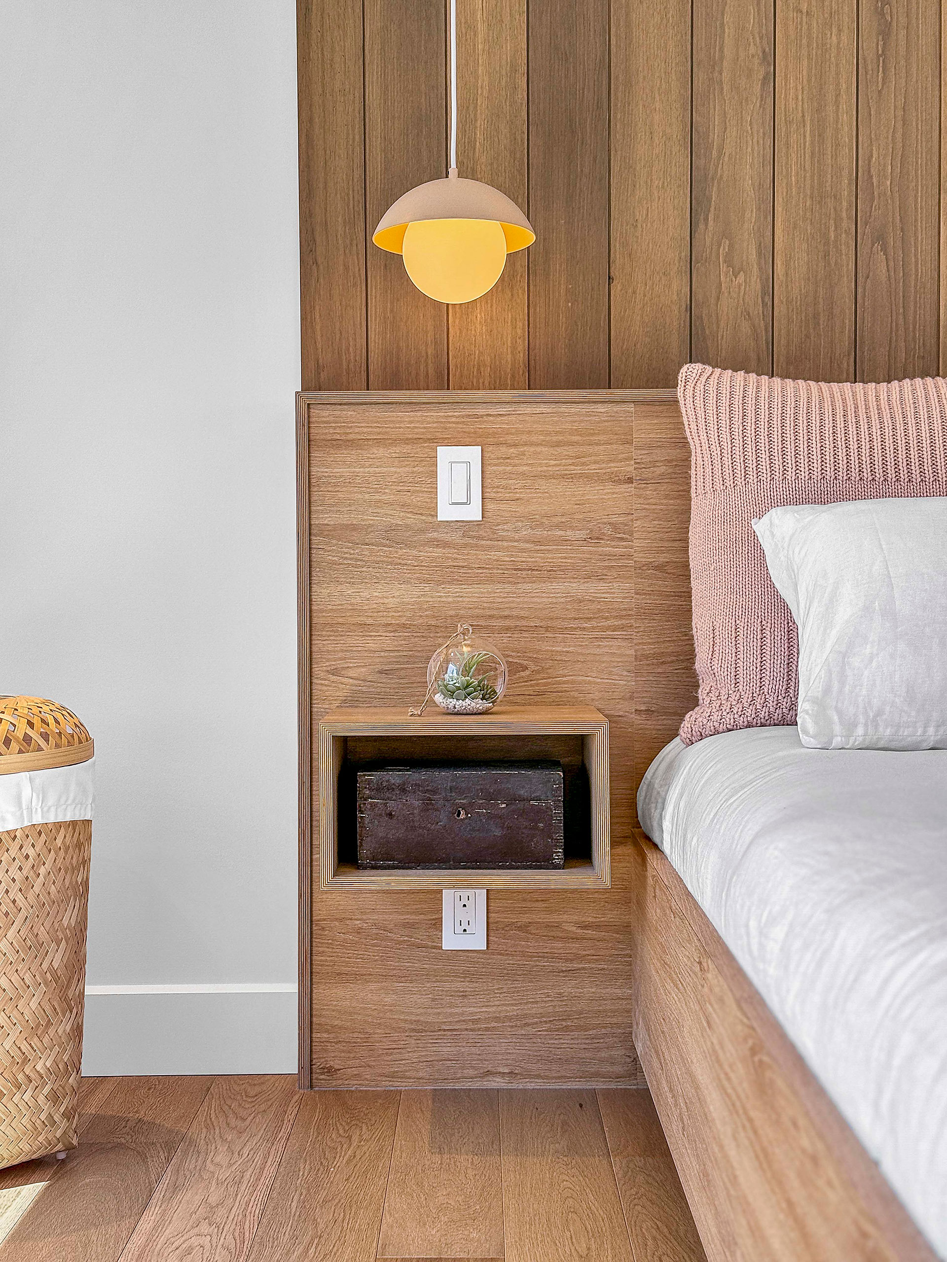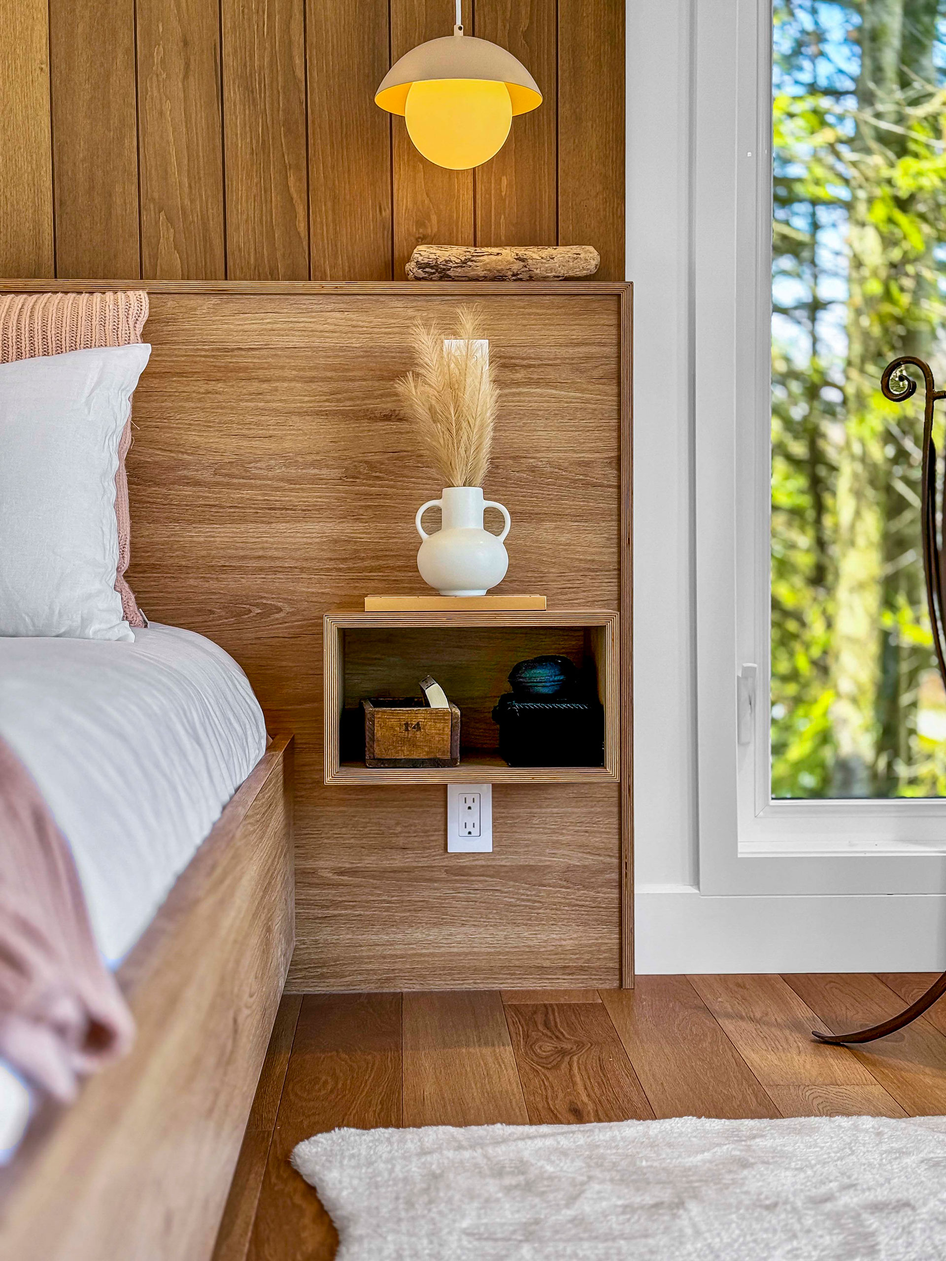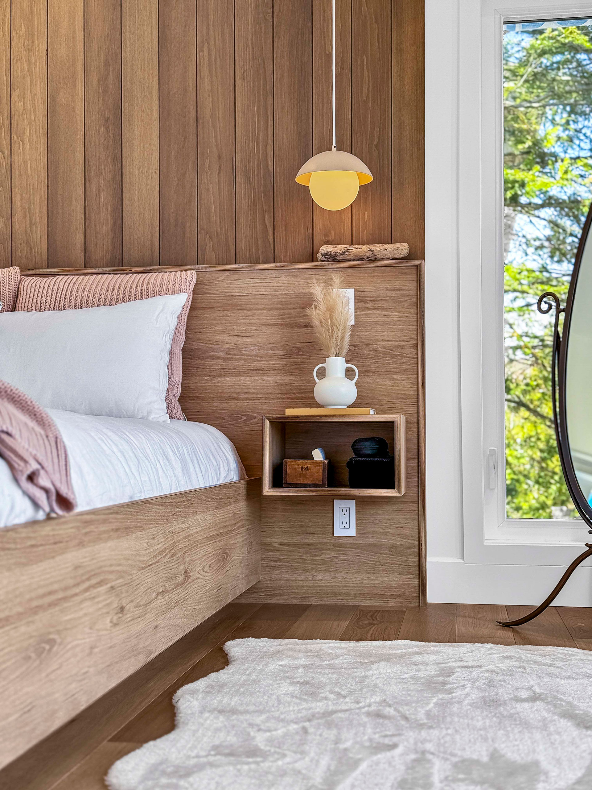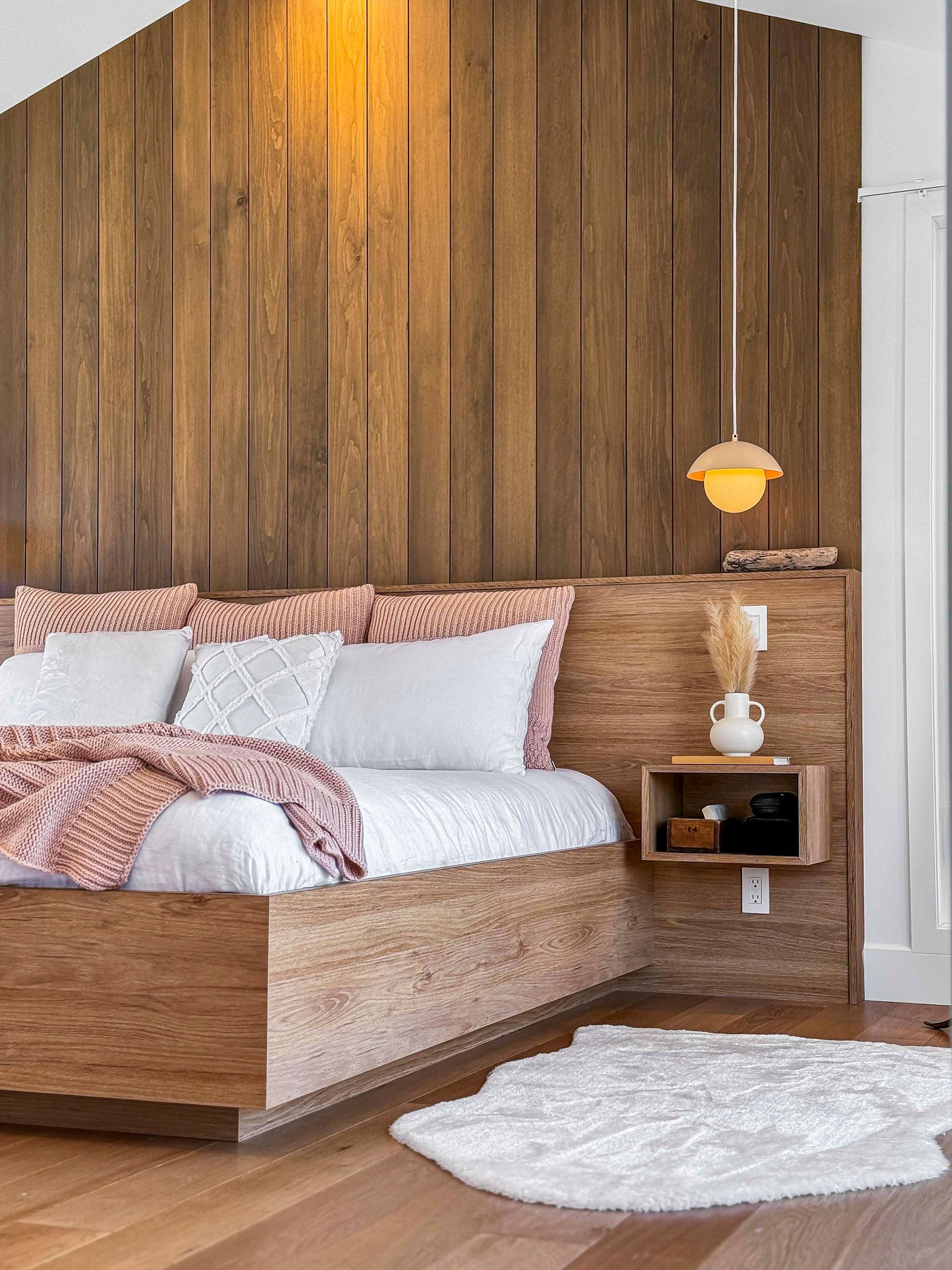 Base de lit en mélamine imitation de chêne blanc. Tête de lit et tables de chevet intégrées en merisier russe plaqué stratifié en imitation de chêne blanc. Assemblage en 45.