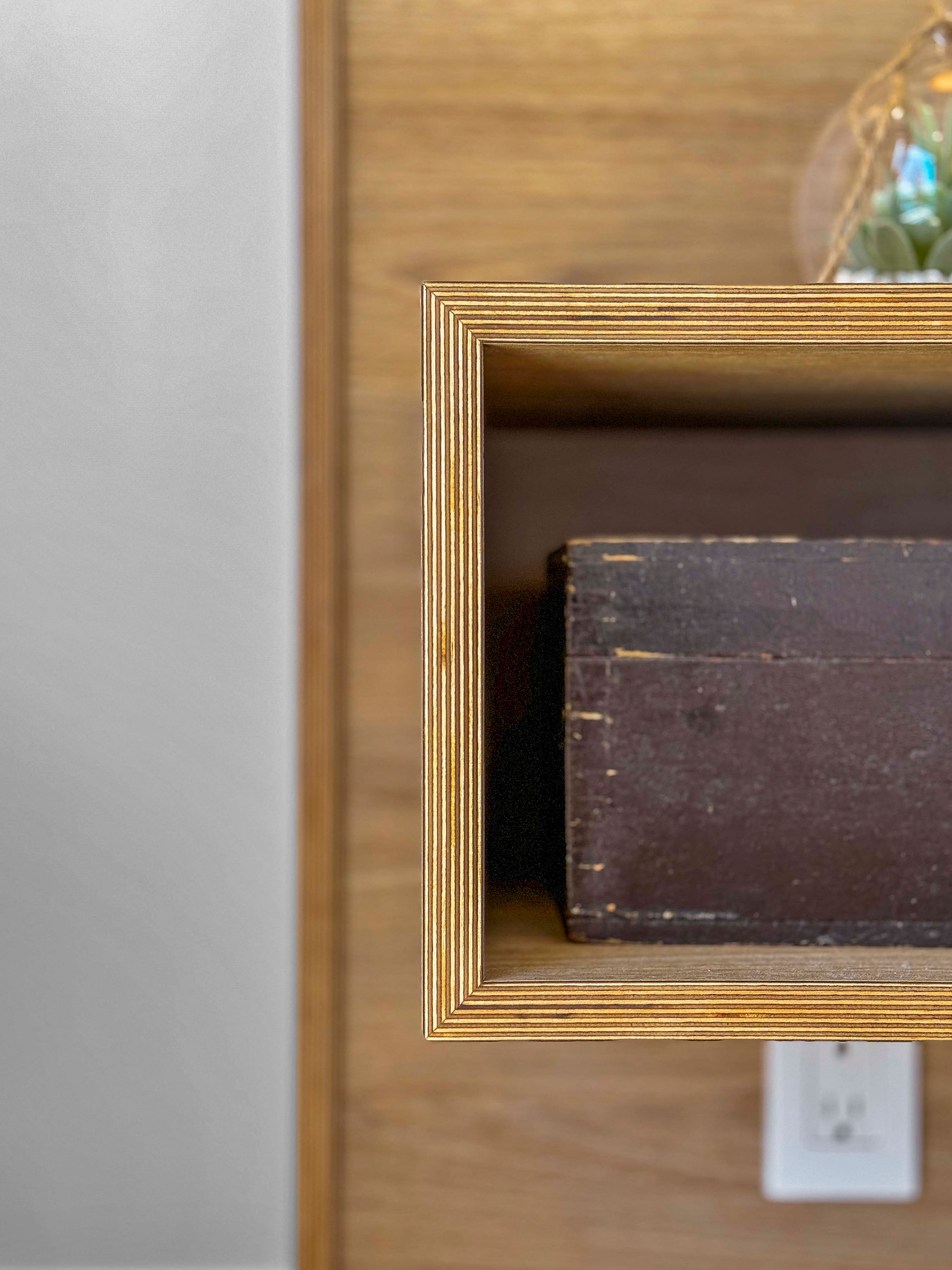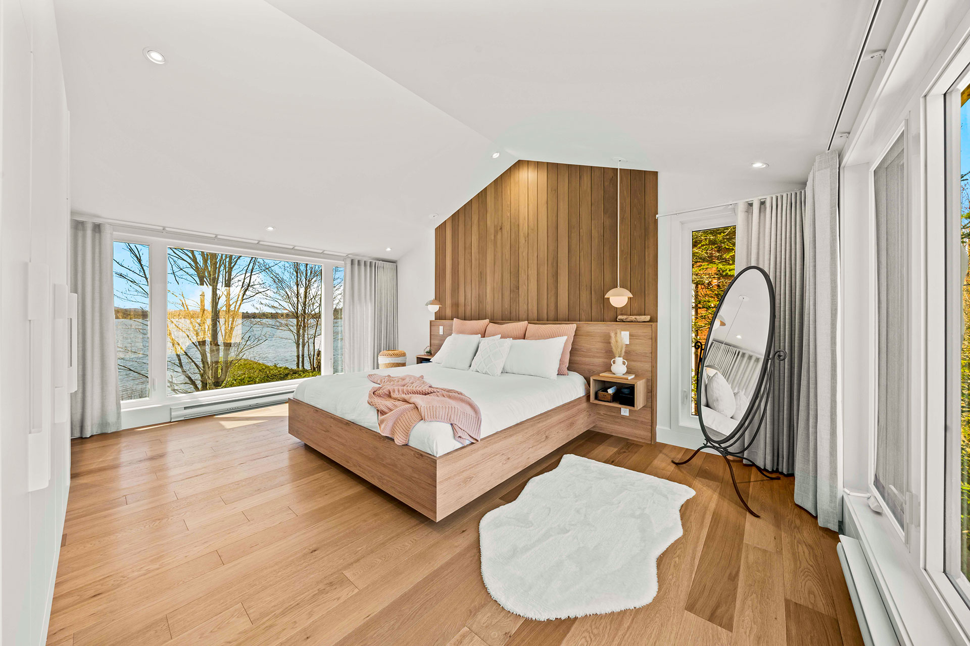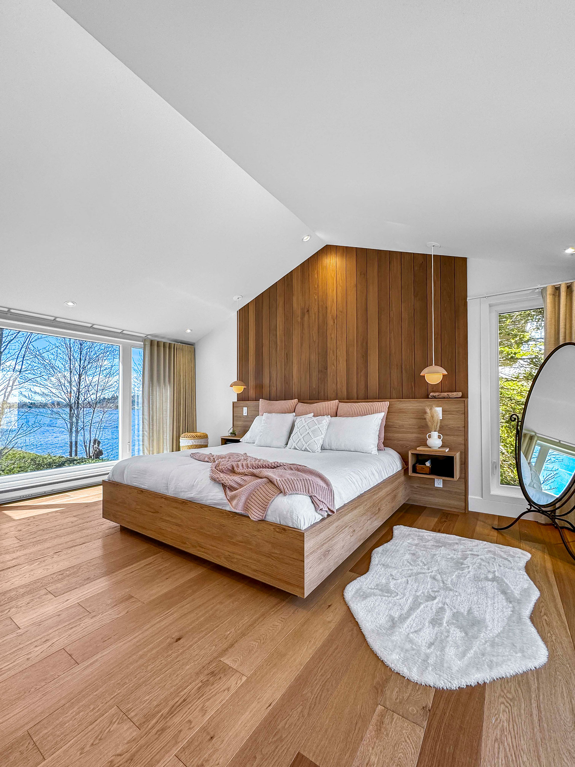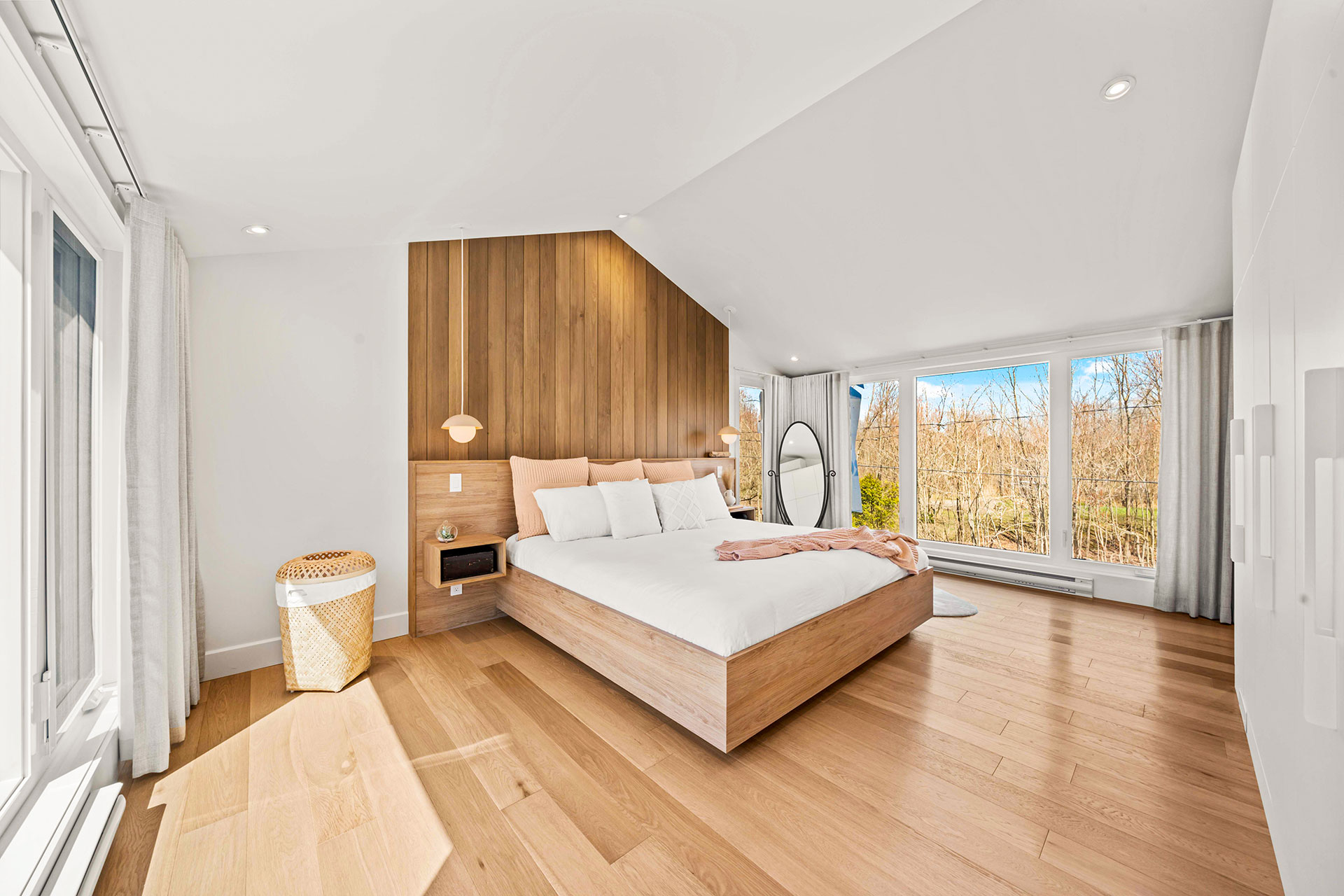 Base de lit en mélamine imitation de chêne blanc. Tête de lit et tables de chevet intégrées en merisier russe plaqué stratifié en imitation de chêne blanc. Assemblage en 45.