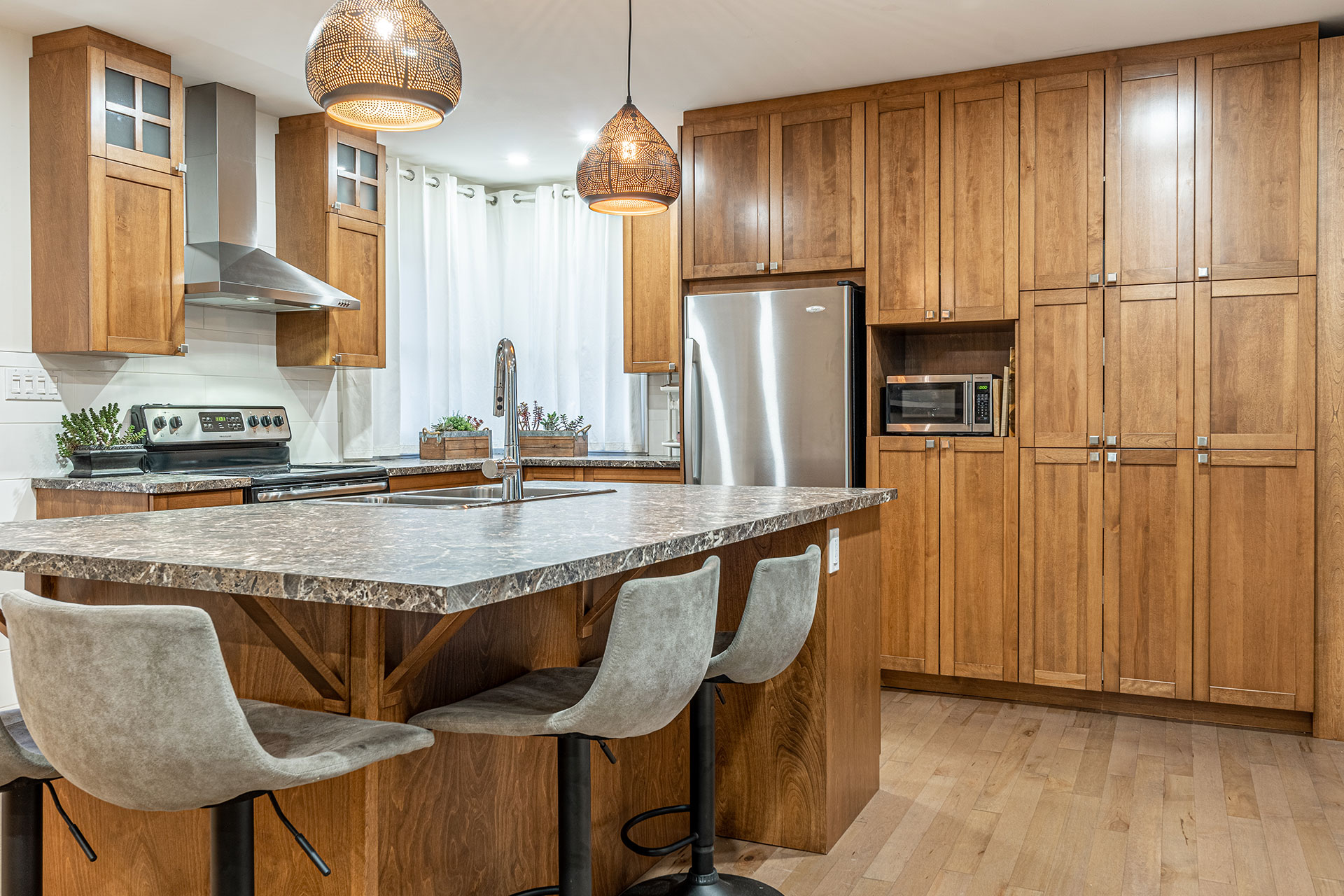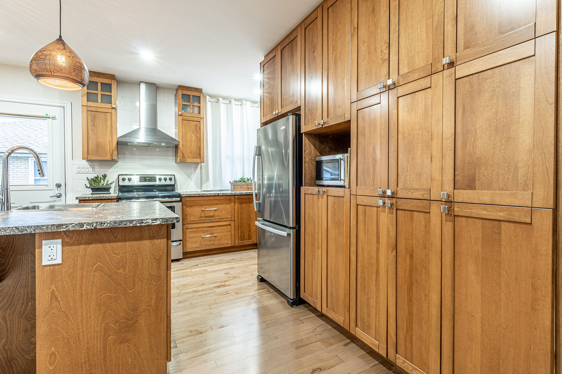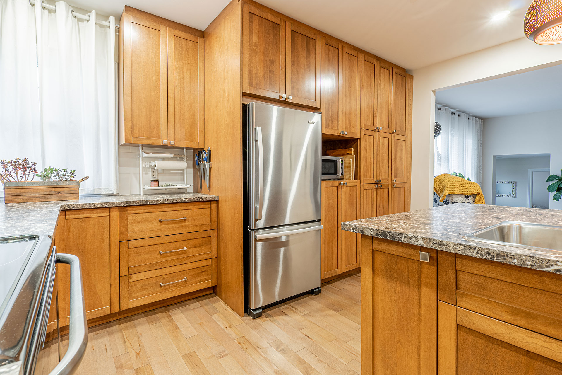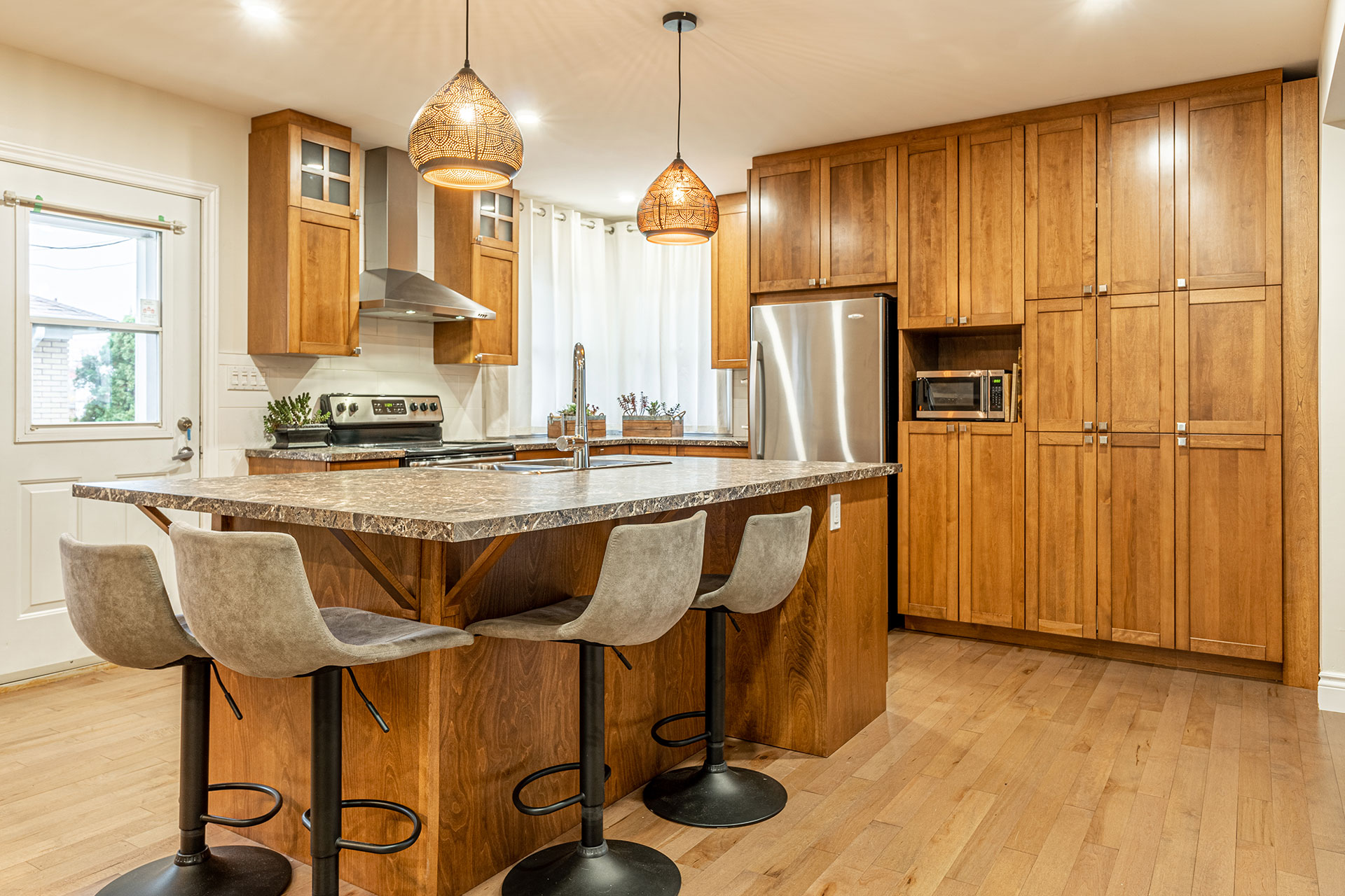 Armoires et îlot de cuisine avec caissons en merisier russe verni naturel et extérieur en merisier massif verni et comptoir en stratifié.