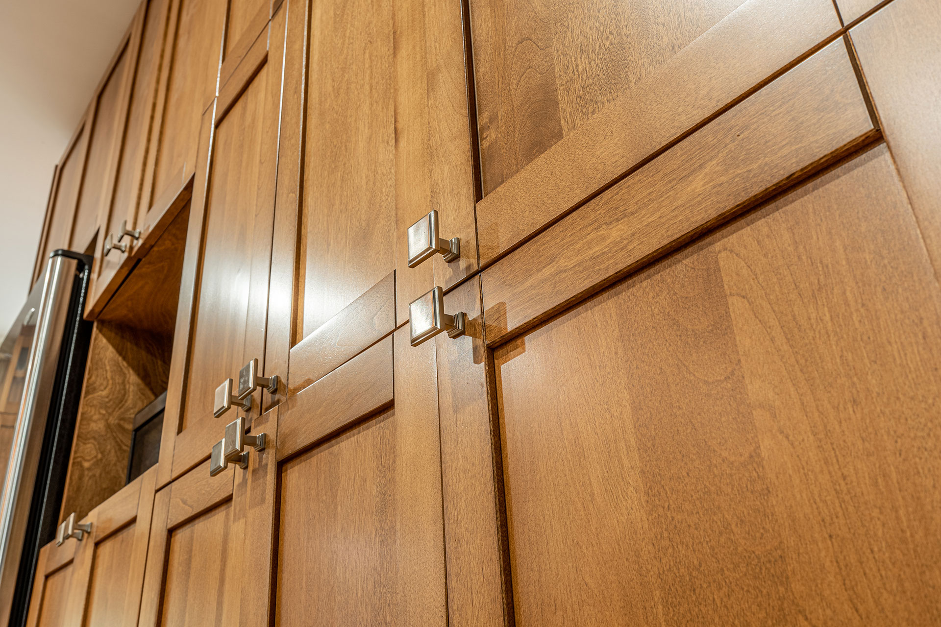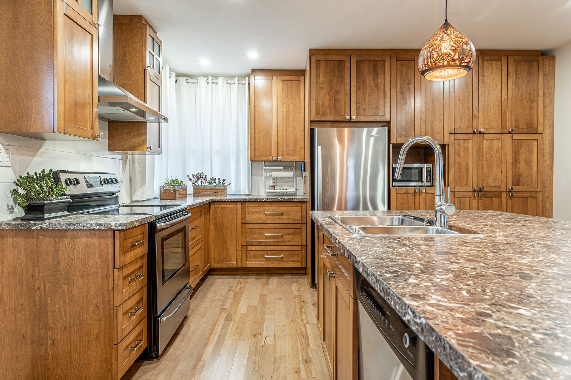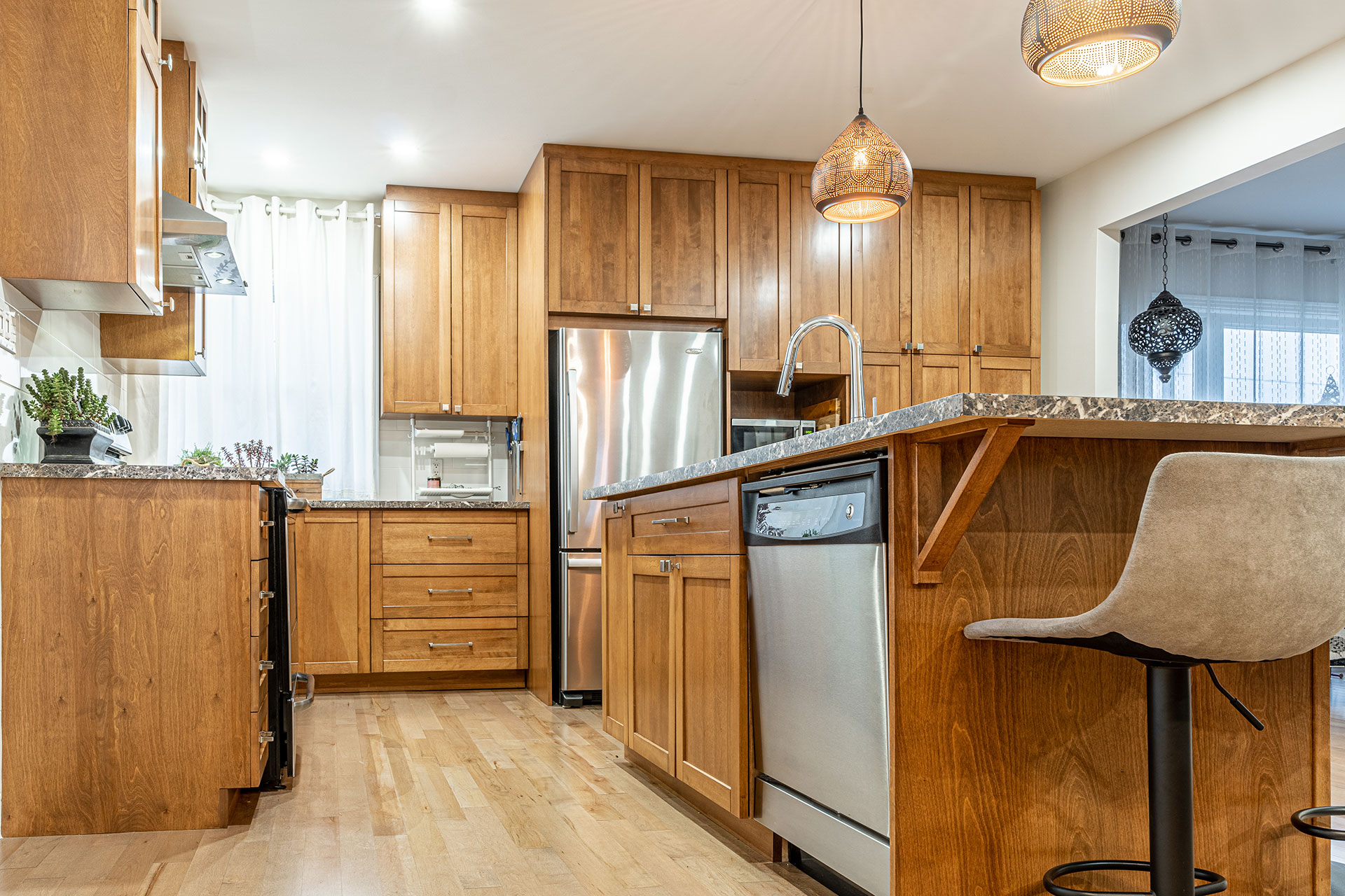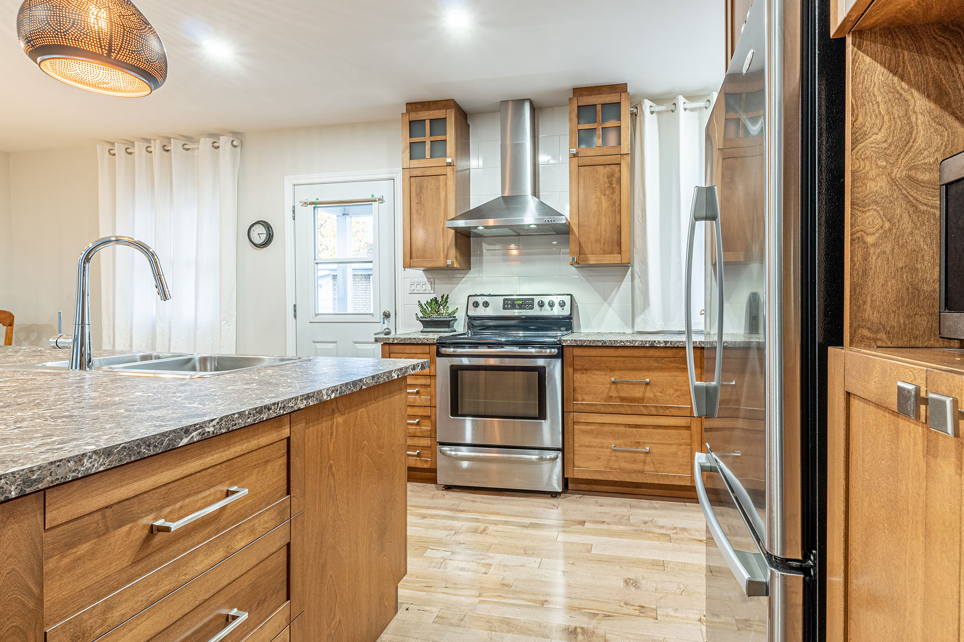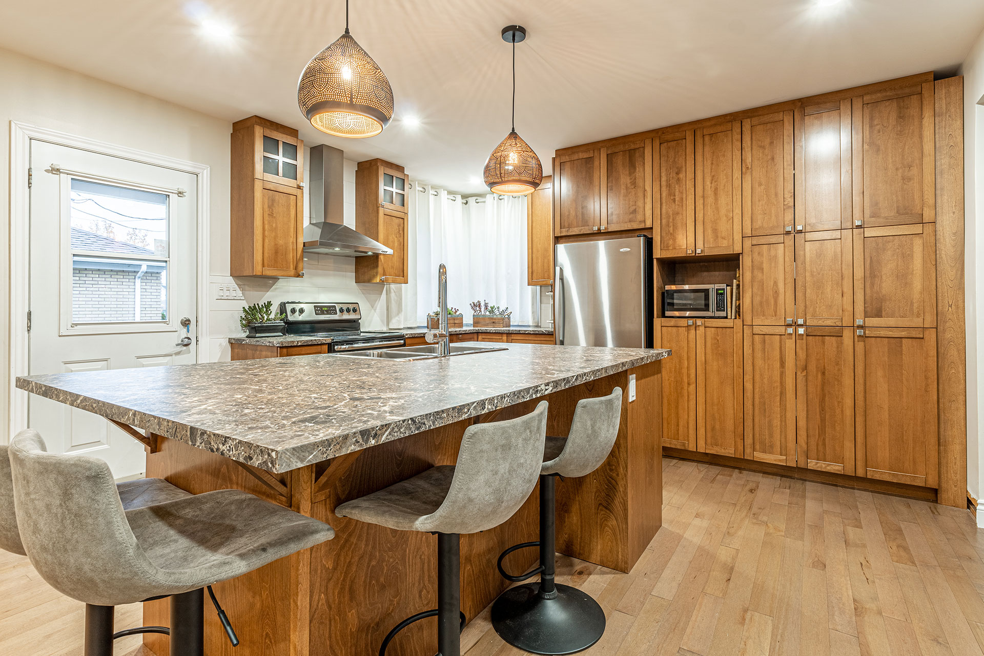 Armoires et îlot de cuisine avec caissons en merisier russe verni naturel et extérieur en merisier massif verni et comptoir en stratifié.