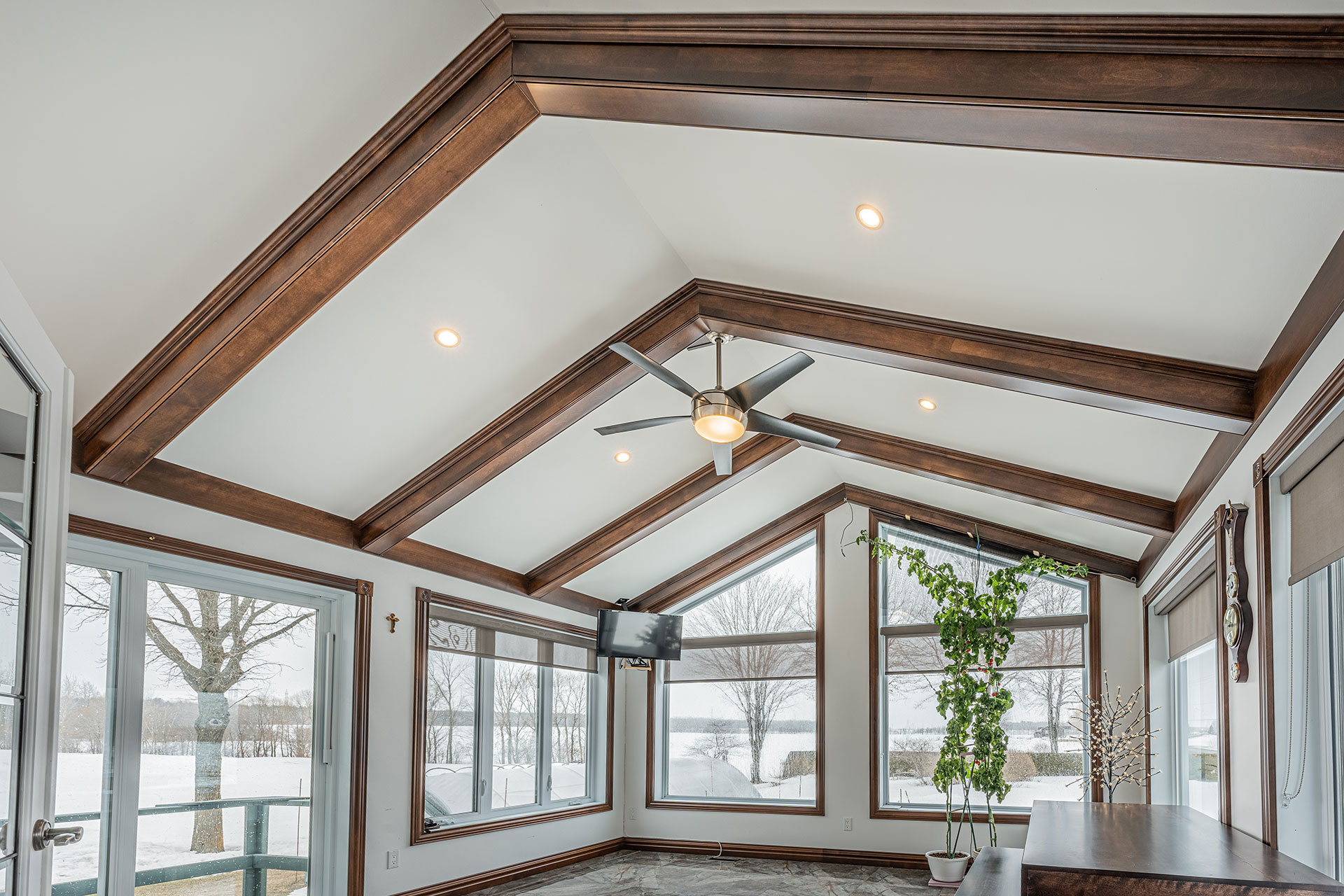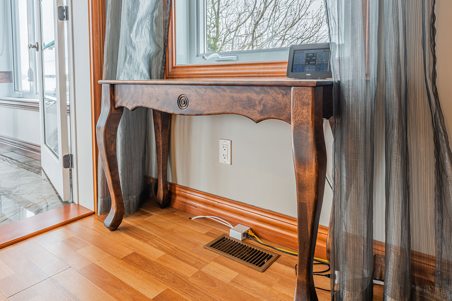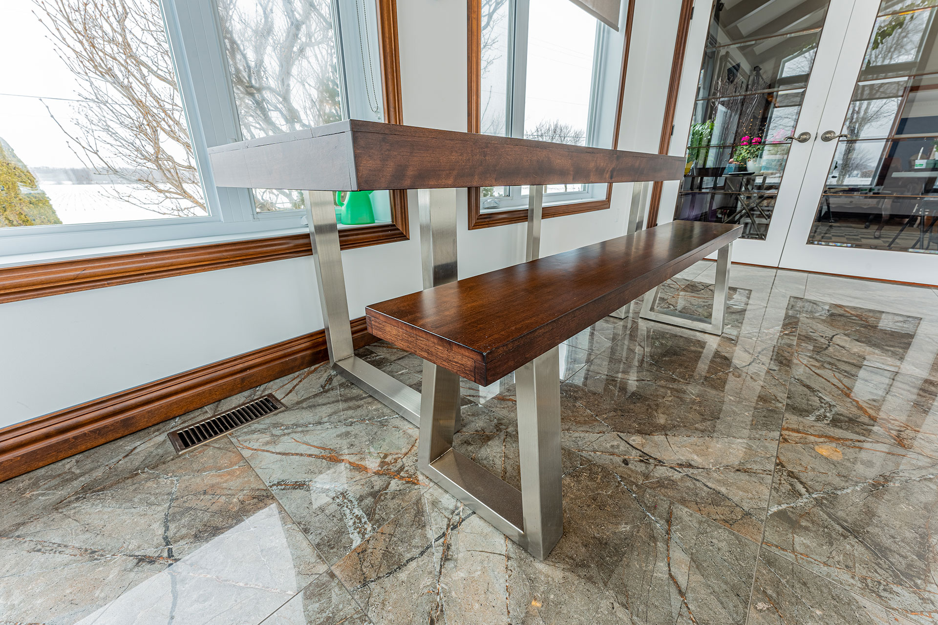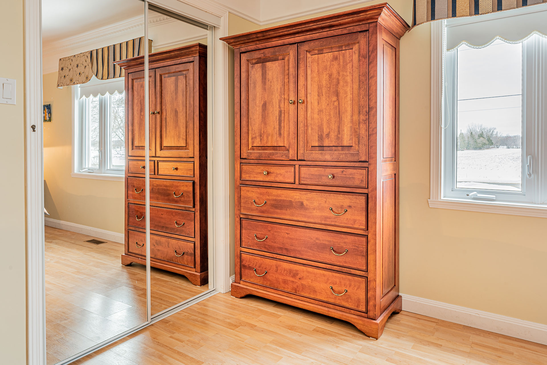 Armoires, descentes de plafond et rangement de cuisine personnalisés avec huche à pain, comptoir déjeuner et bibliothèque intégrés en merisier teint et verni.