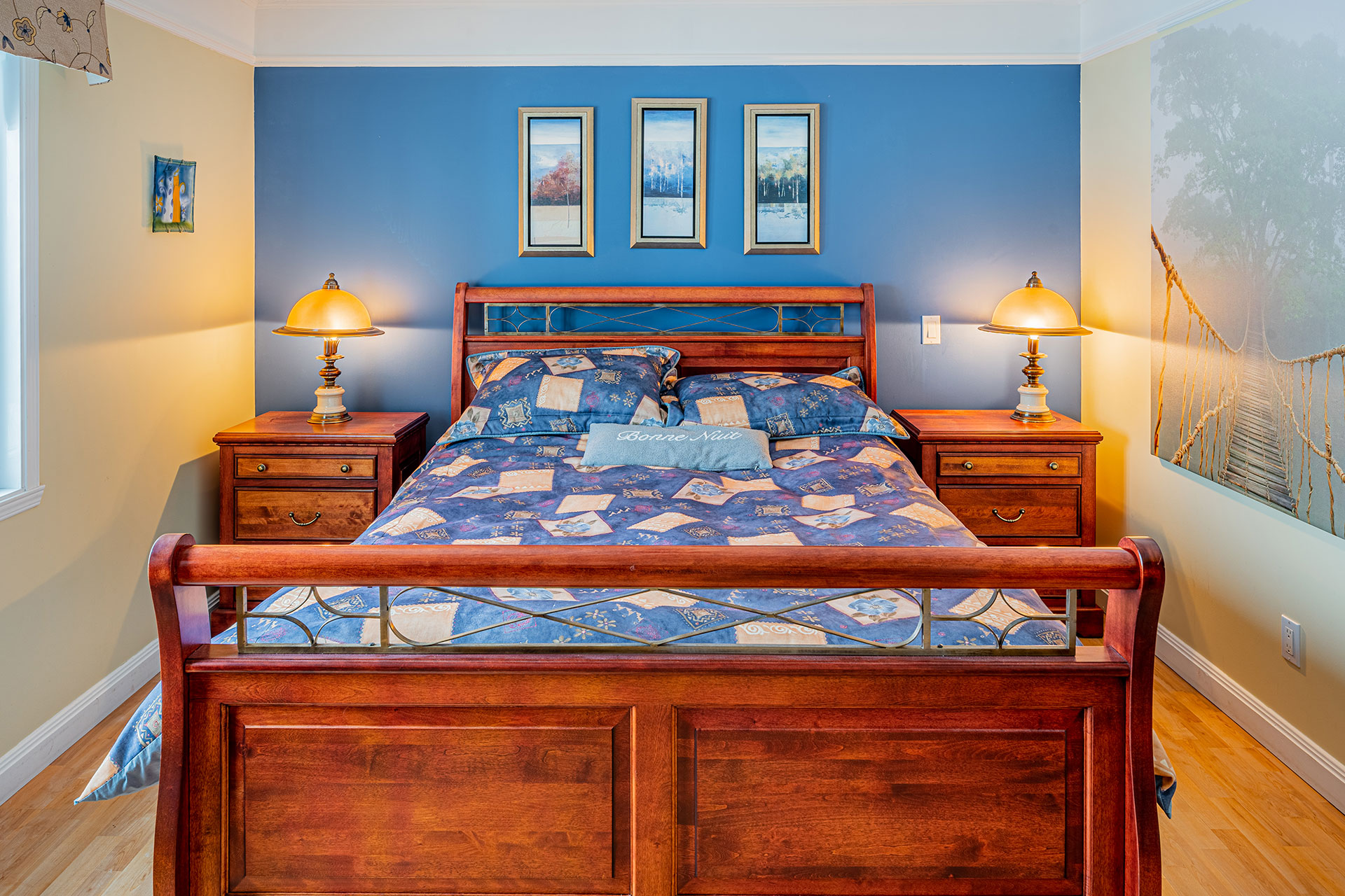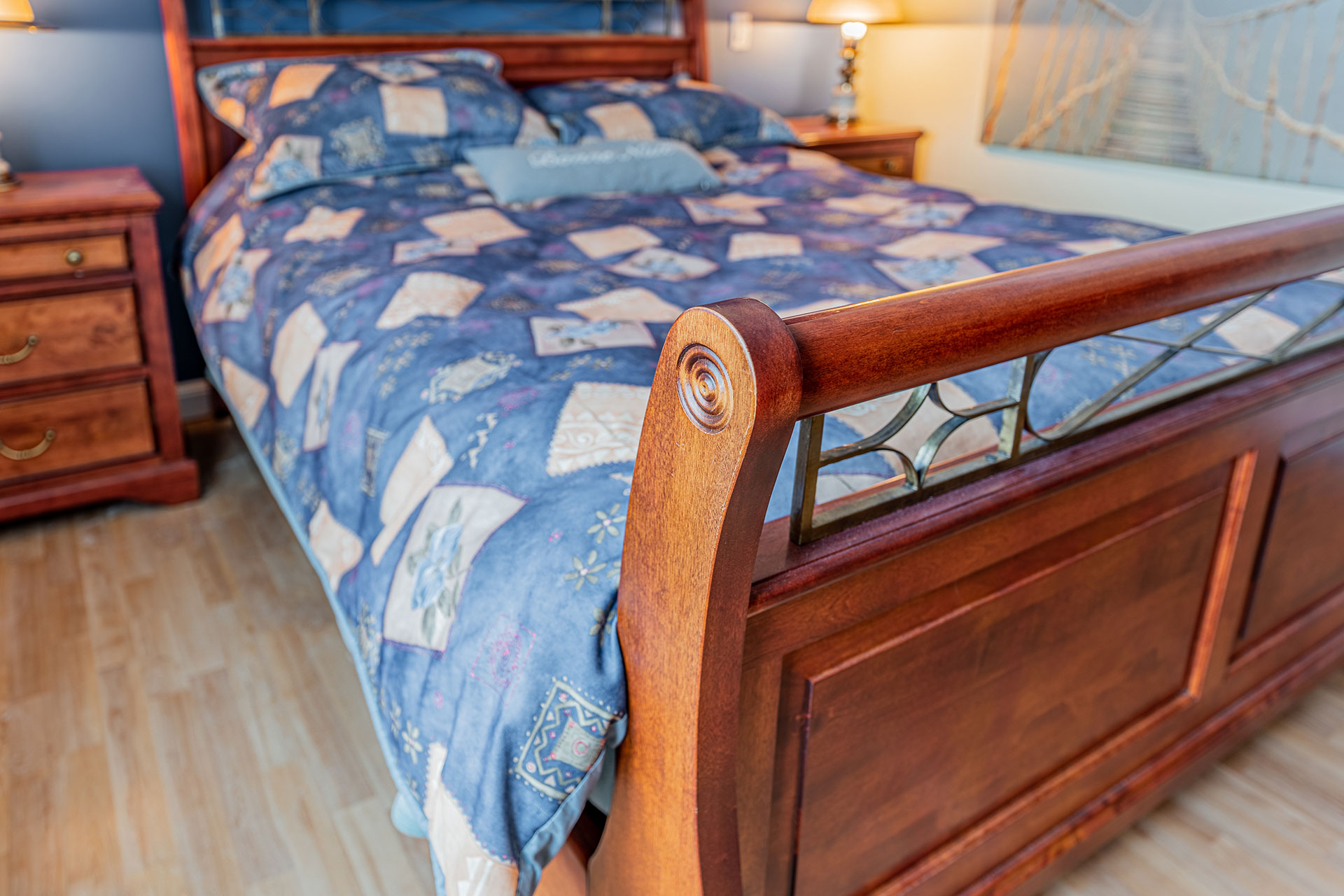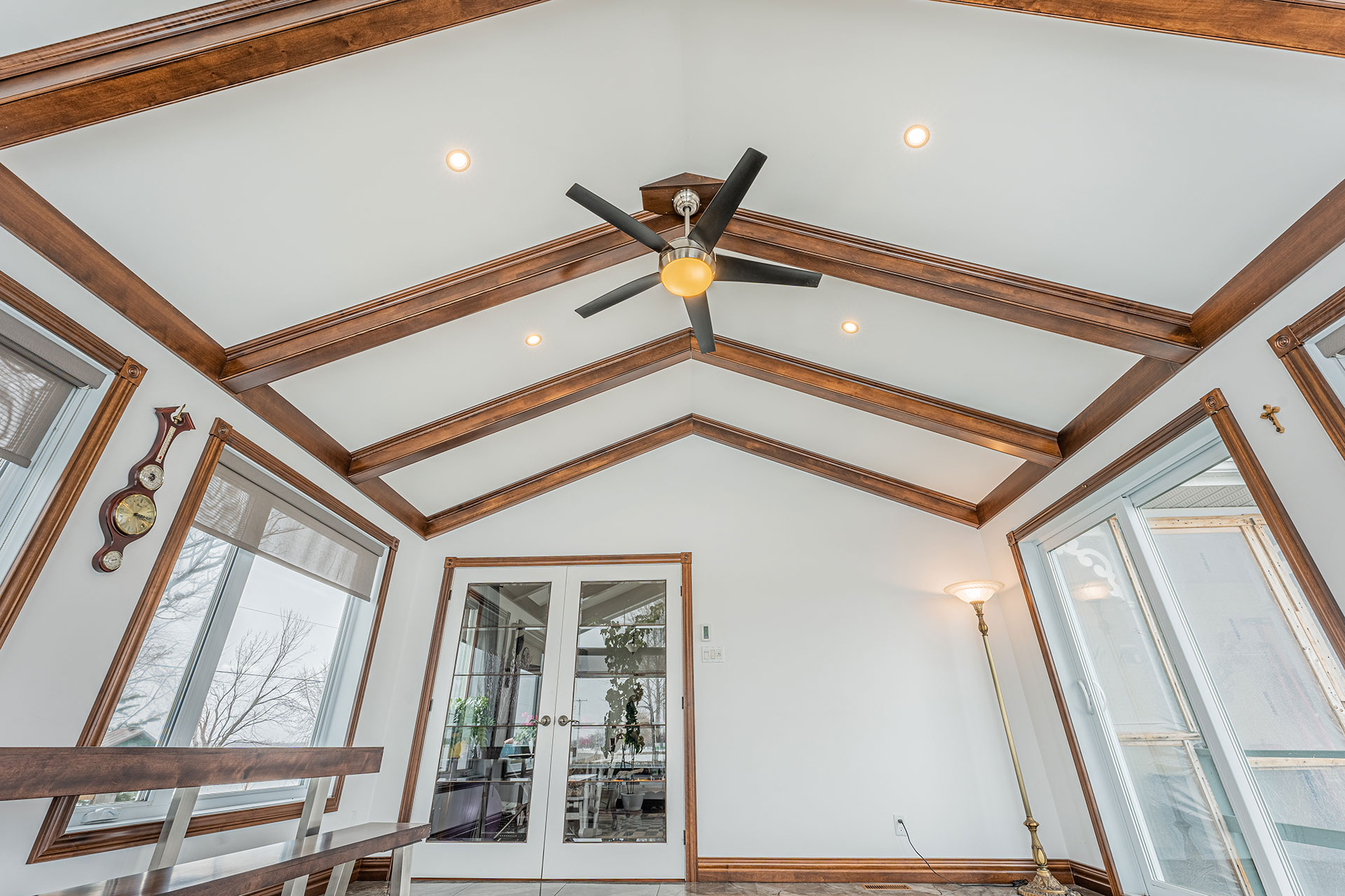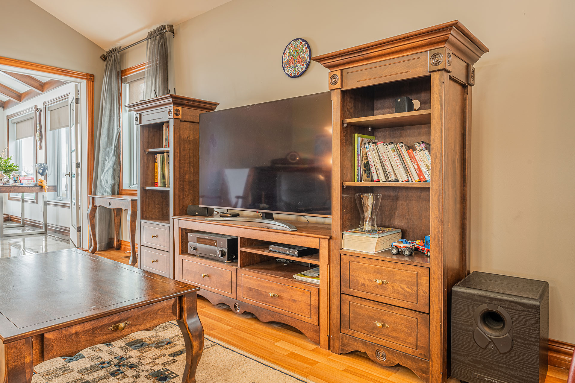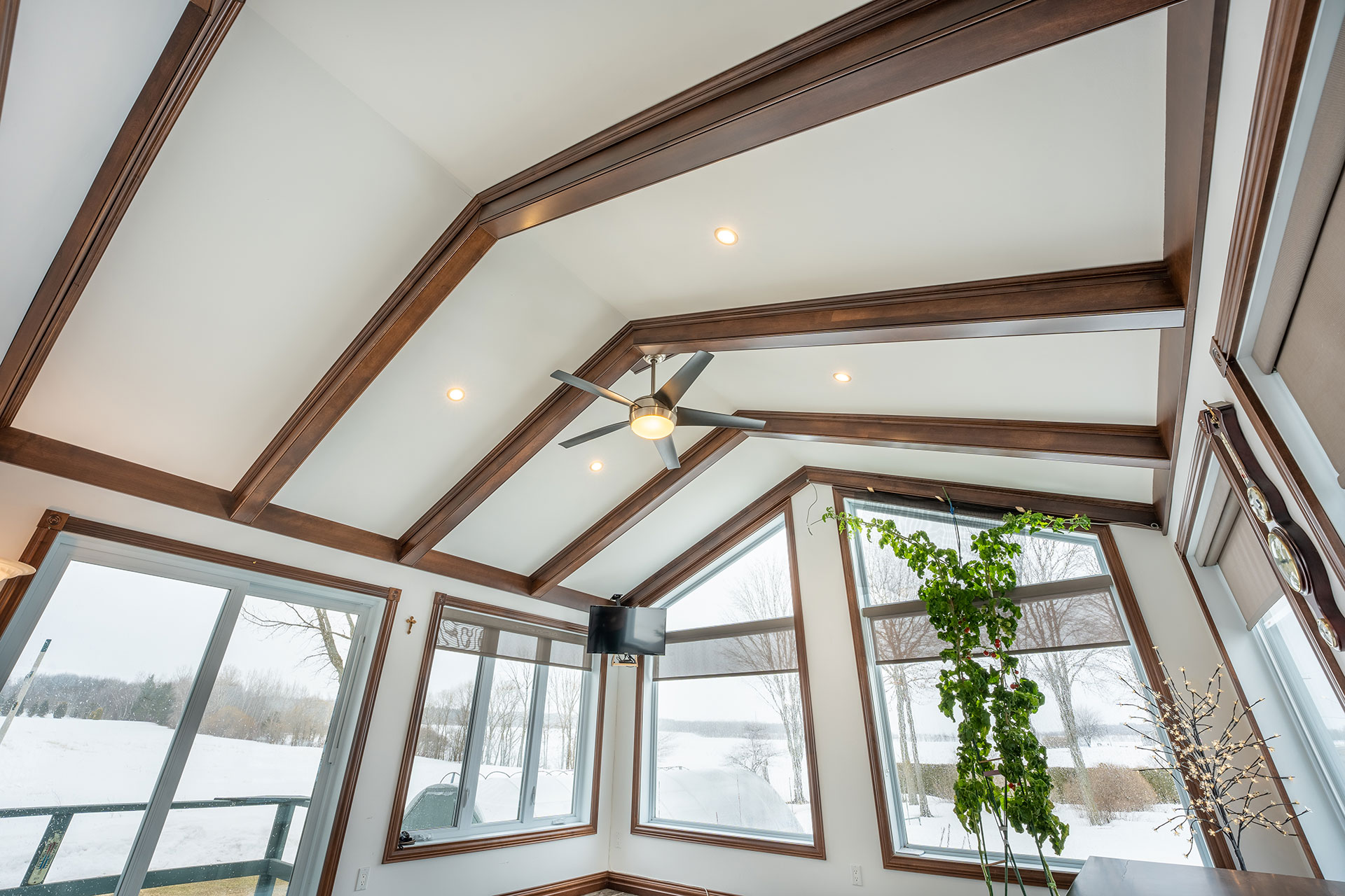 Armoires, descentes de plafond et rangement de cuisine personnalisés avec huche à pain, comptoir déjeuner et bibliothèque intégrés en merisier teint et verni.