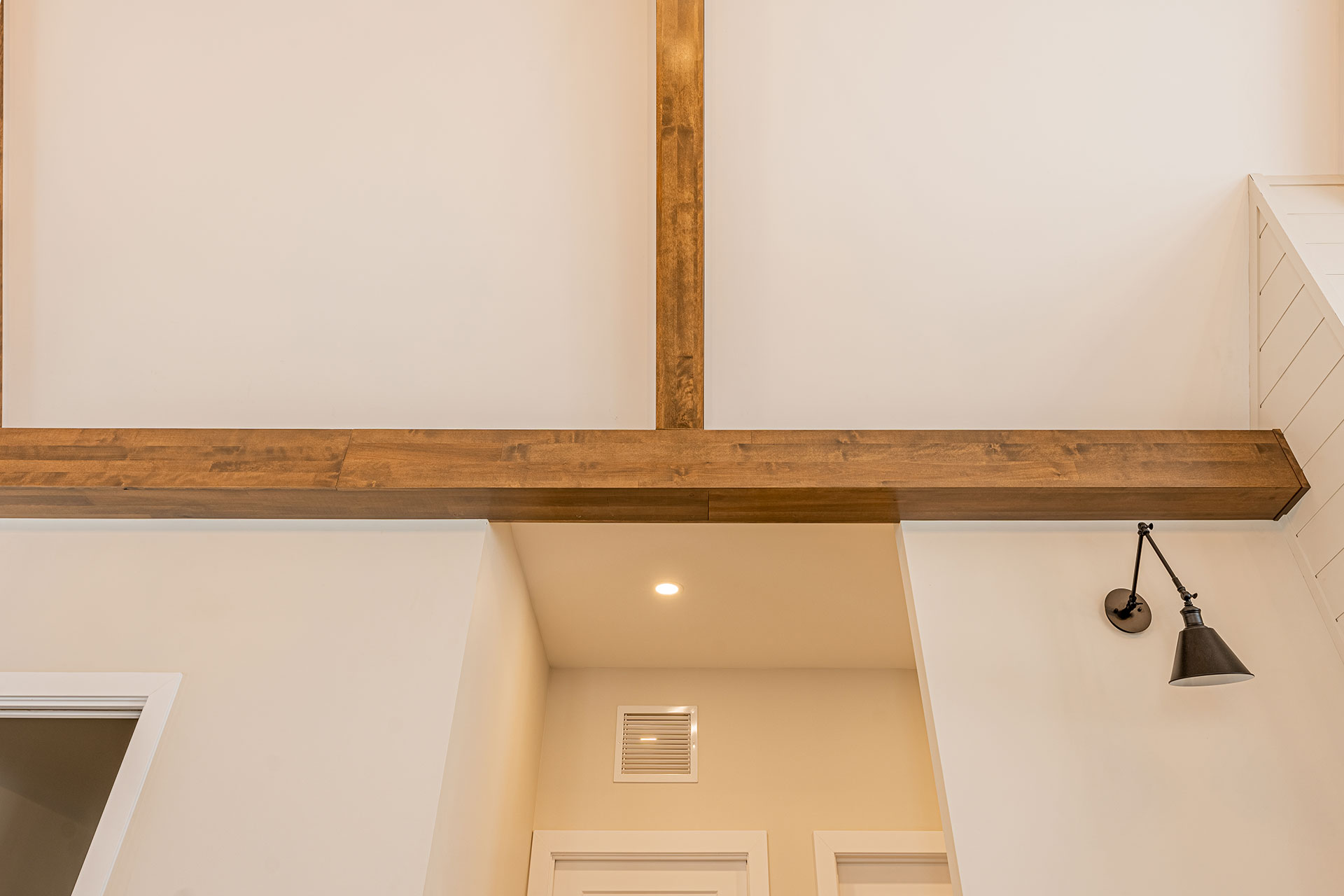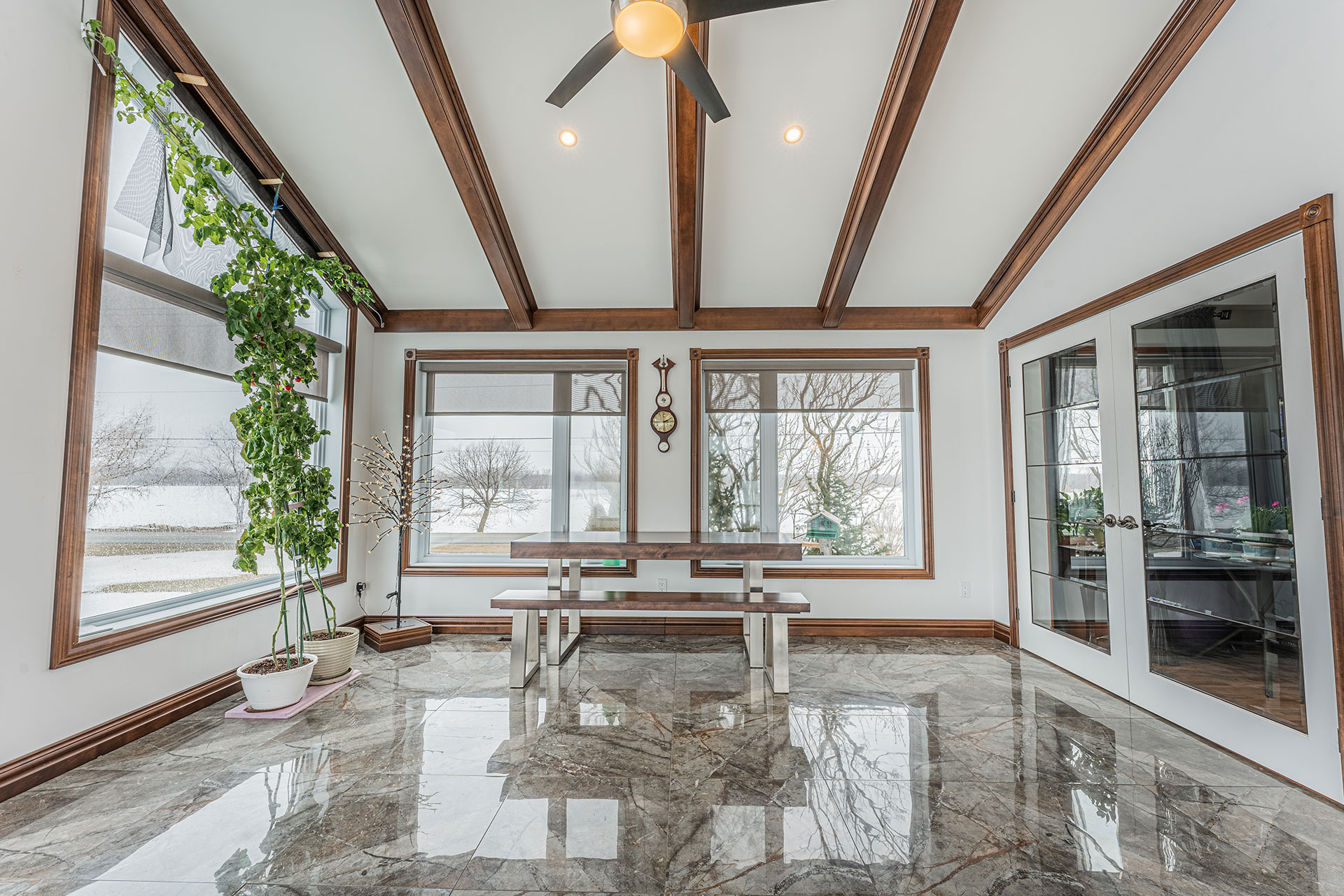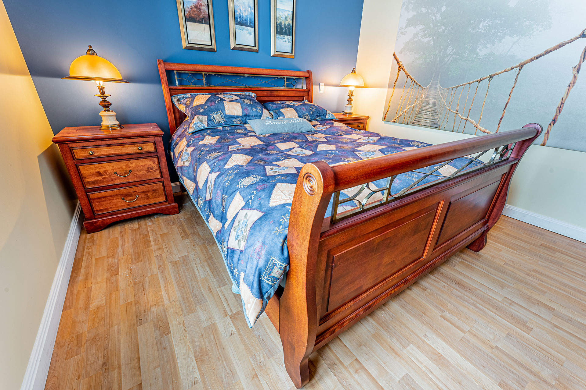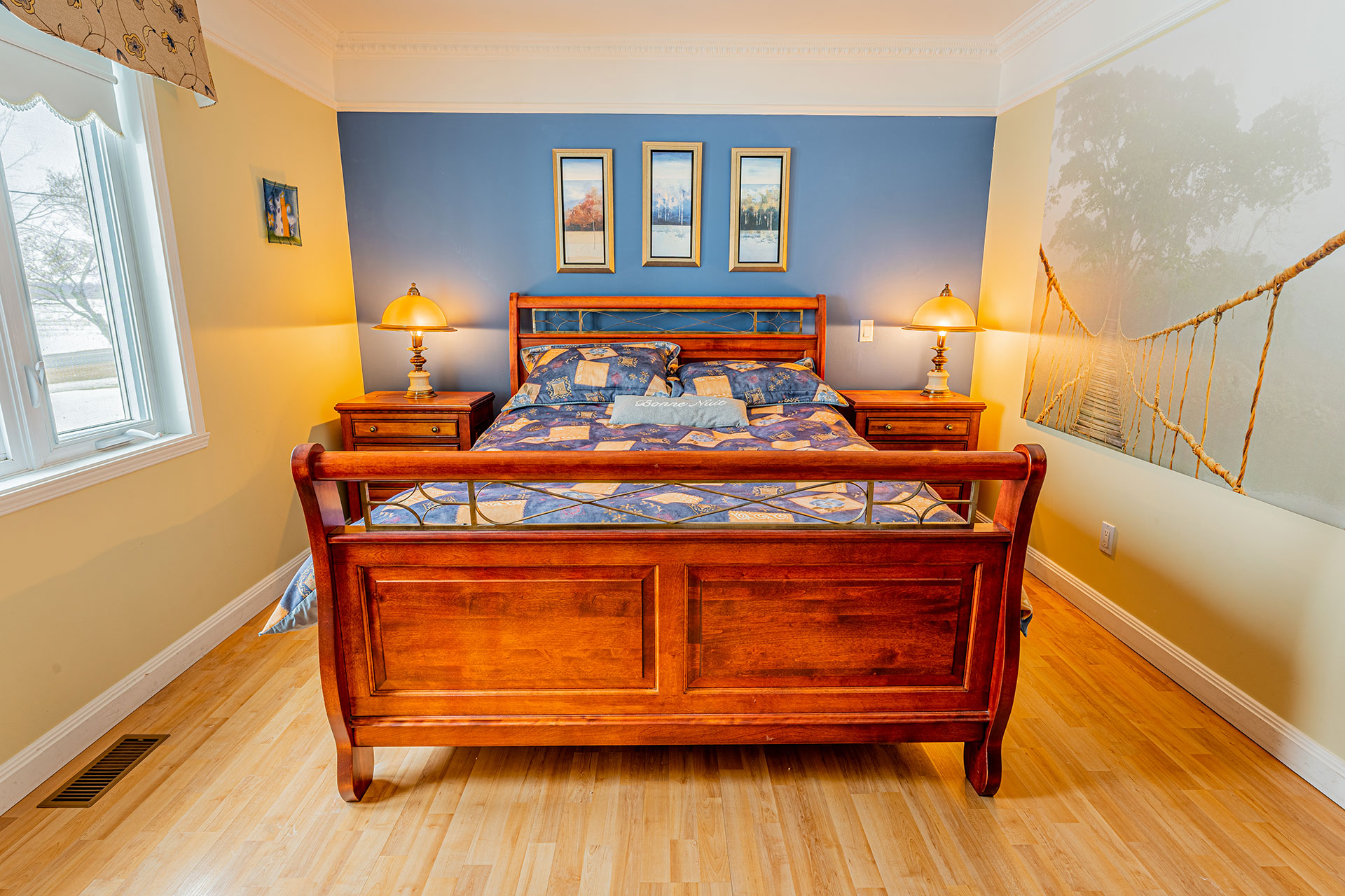 Armoires, descentes de plafond et rangement de cuisine personnalisés avec huche à pain, comptoir déjeuner et bibliothèque intégrés en merisier teint et verni.