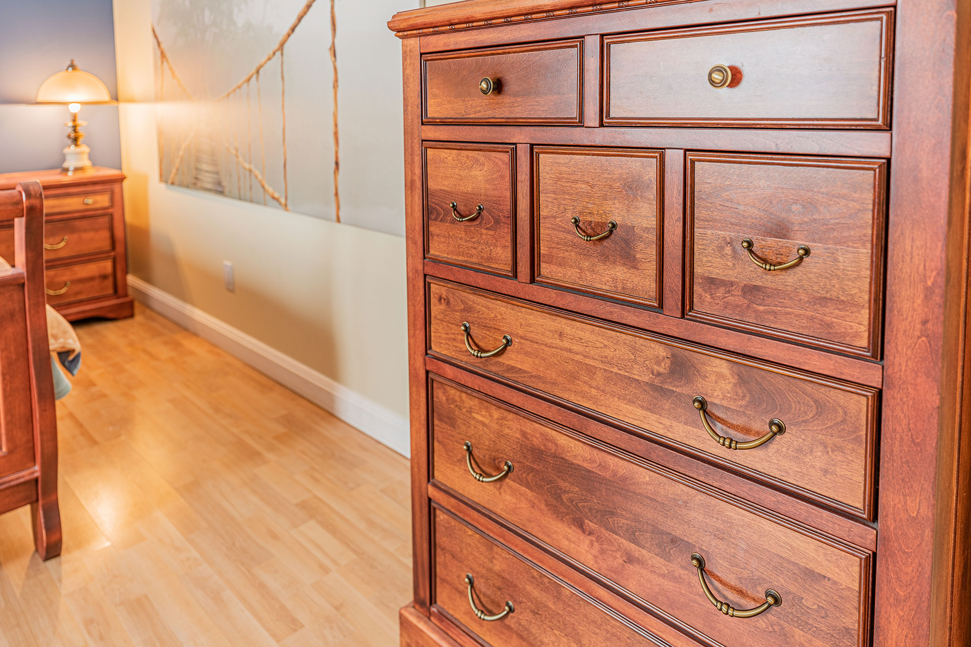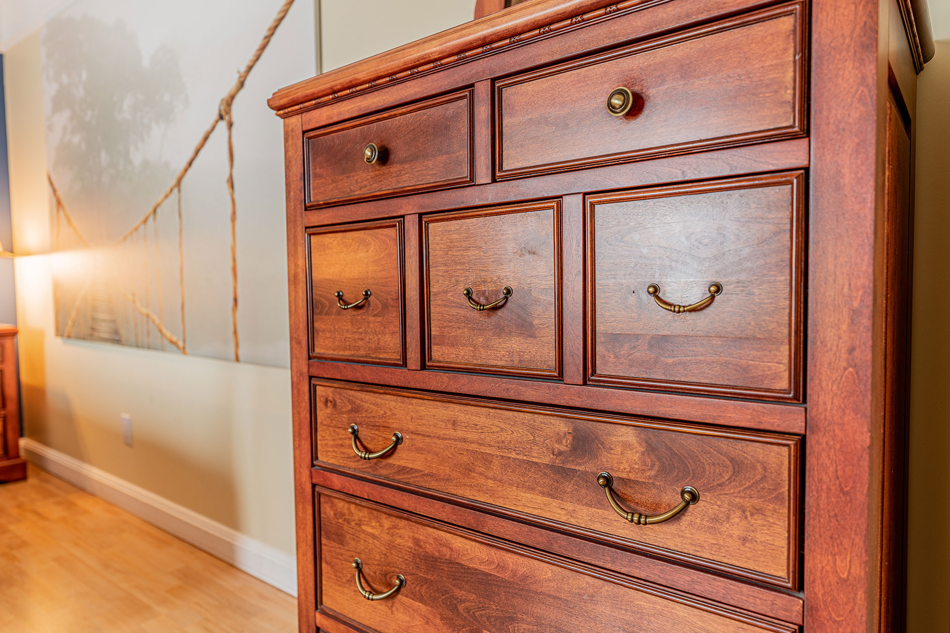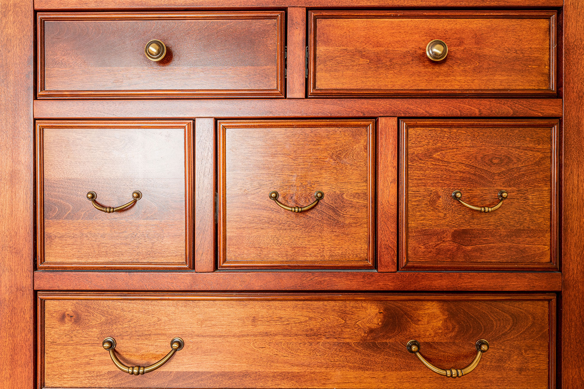Divers éléments d’aménagement, de mobilier et de décoration en merisier teint et verni.