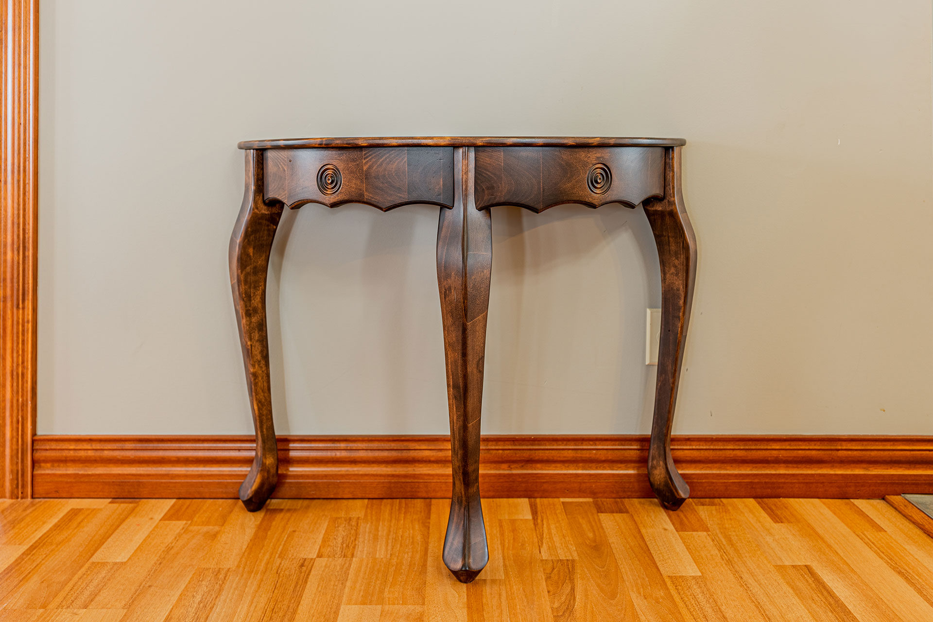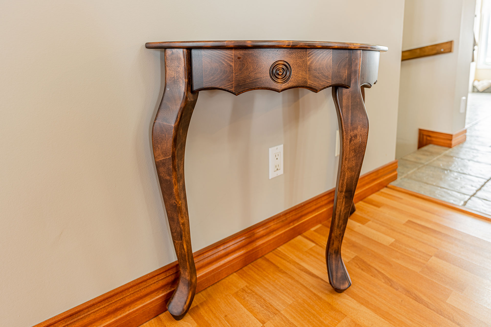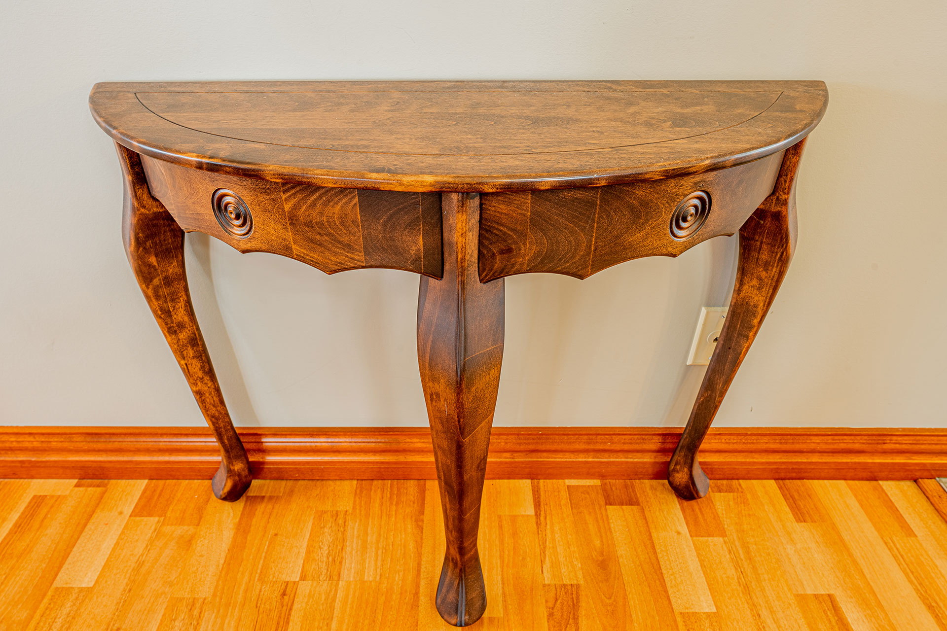 Meuble de rangement média et table de salon en merisier massif teint et verni.