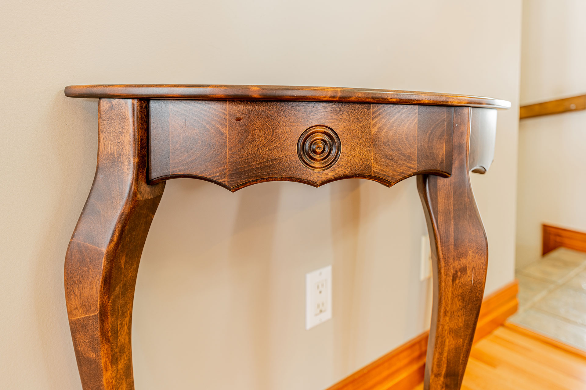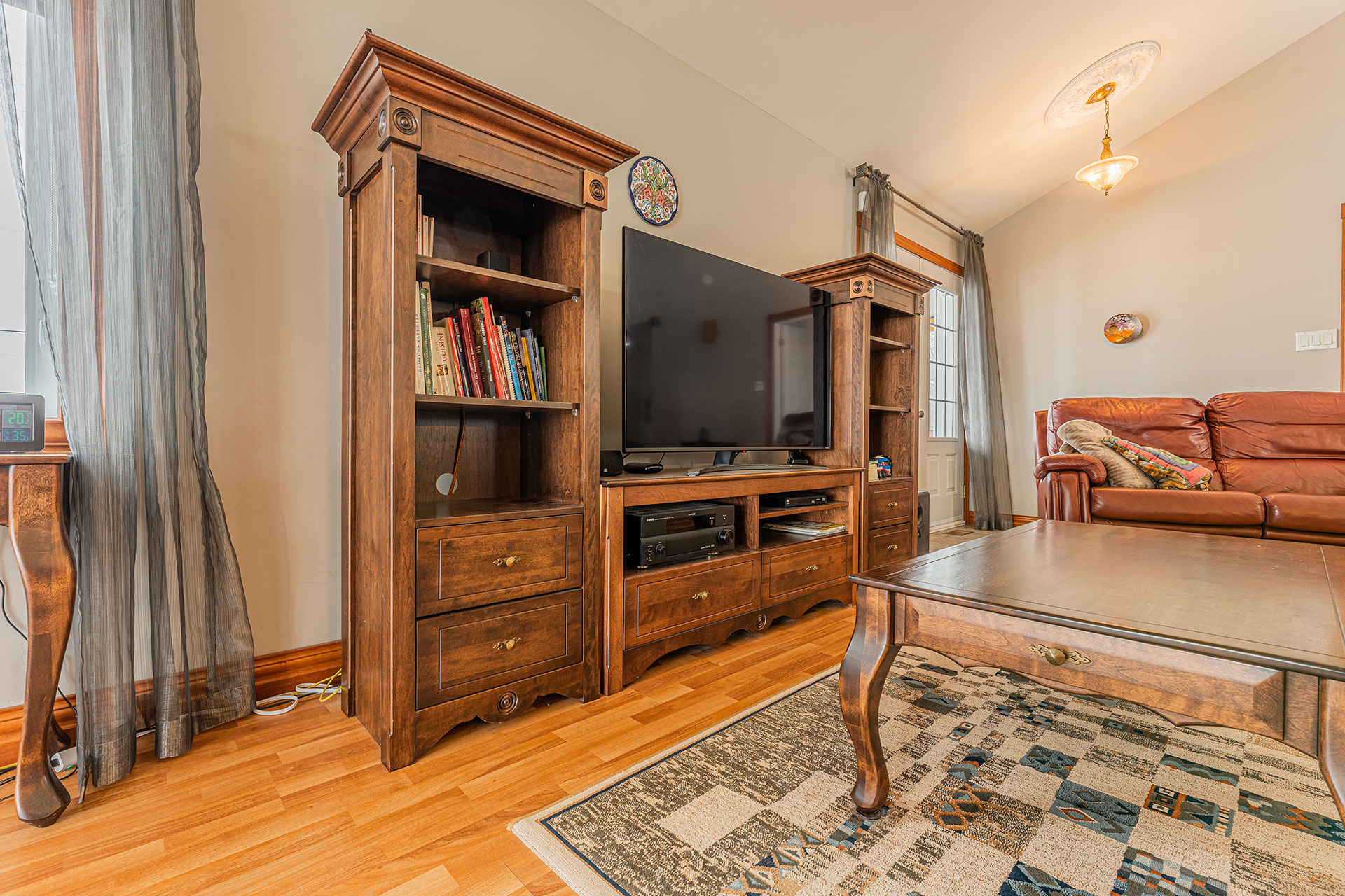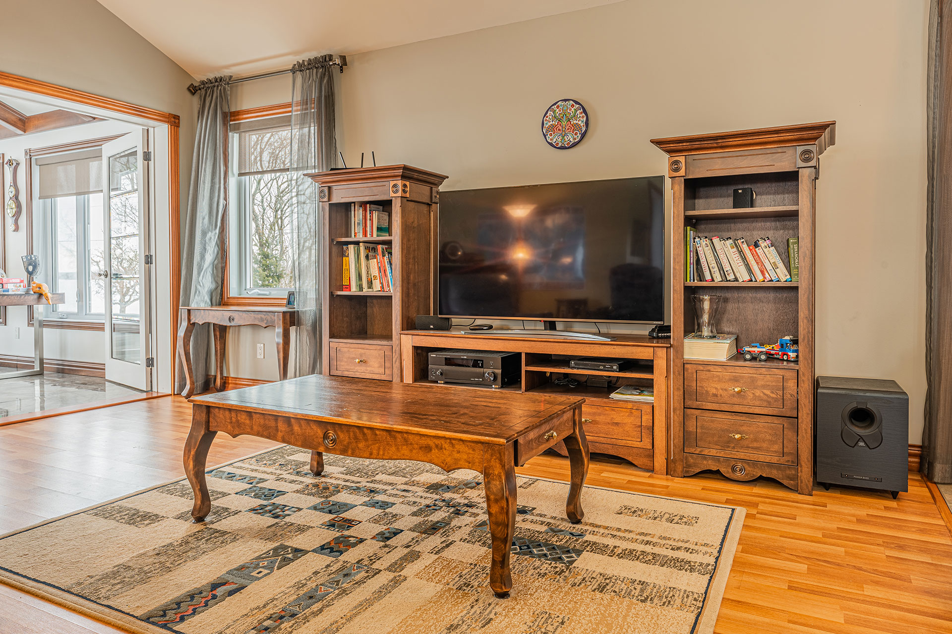 Meuble de rangement média et table de salon en merisier massif teint et verni.