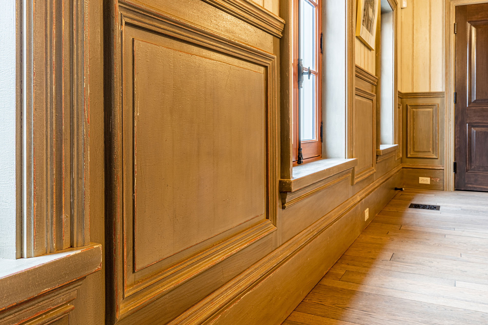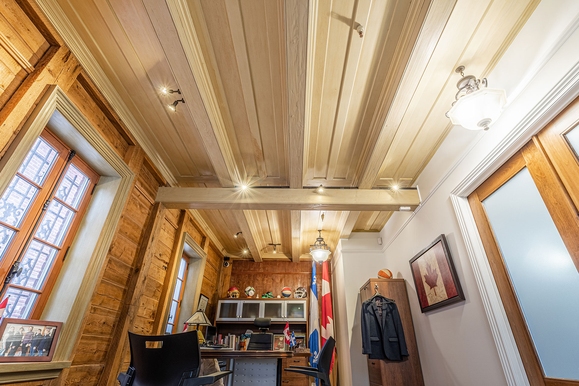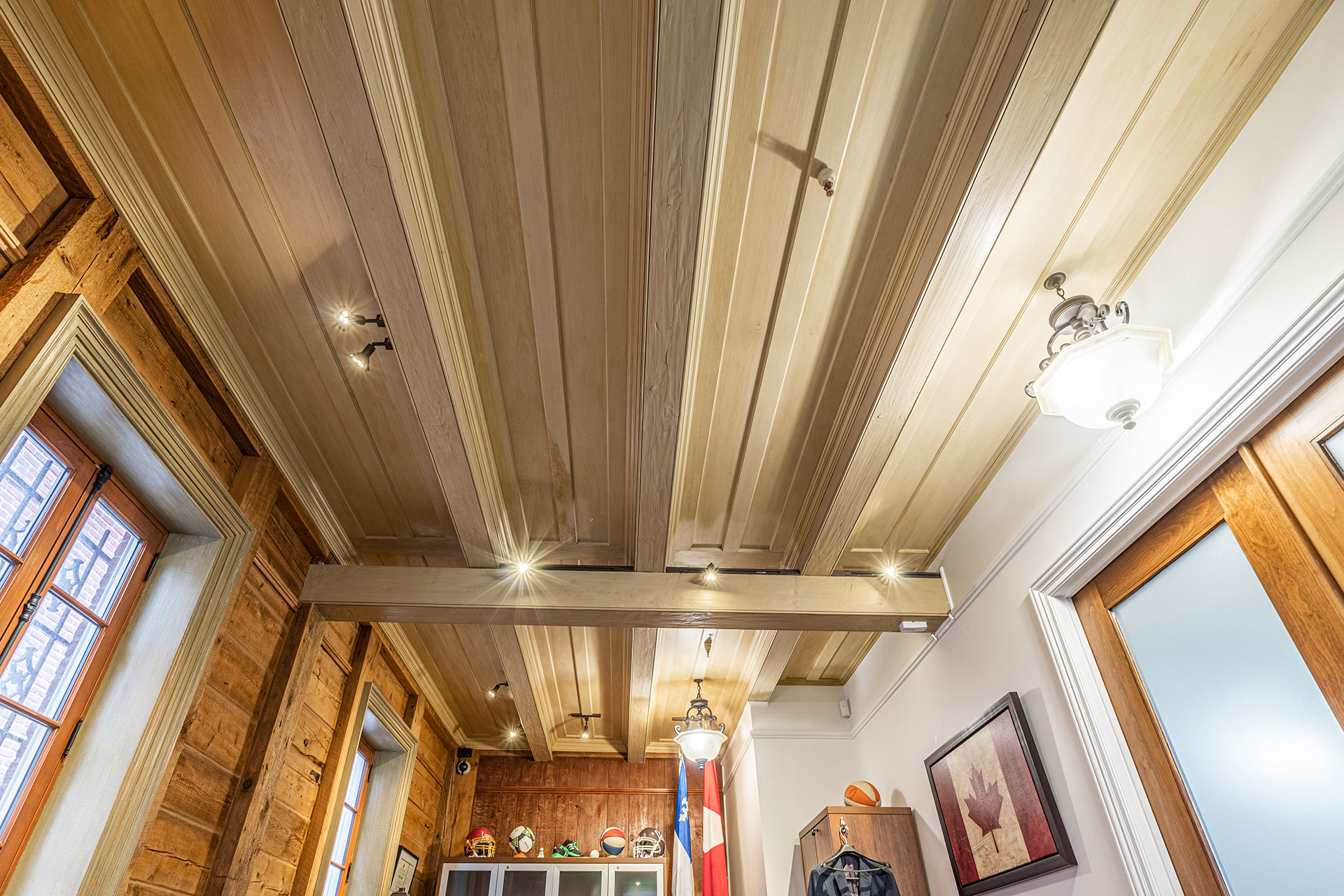 Plafond à caissons fini à la peinture de lait.