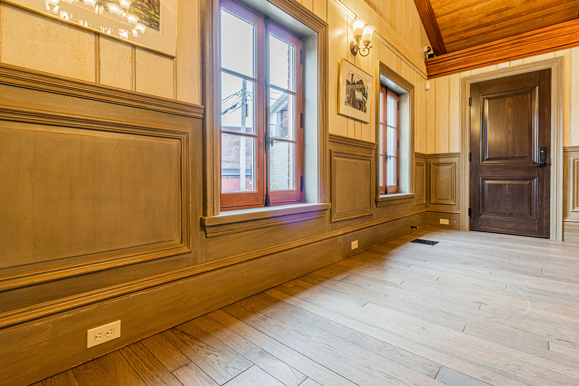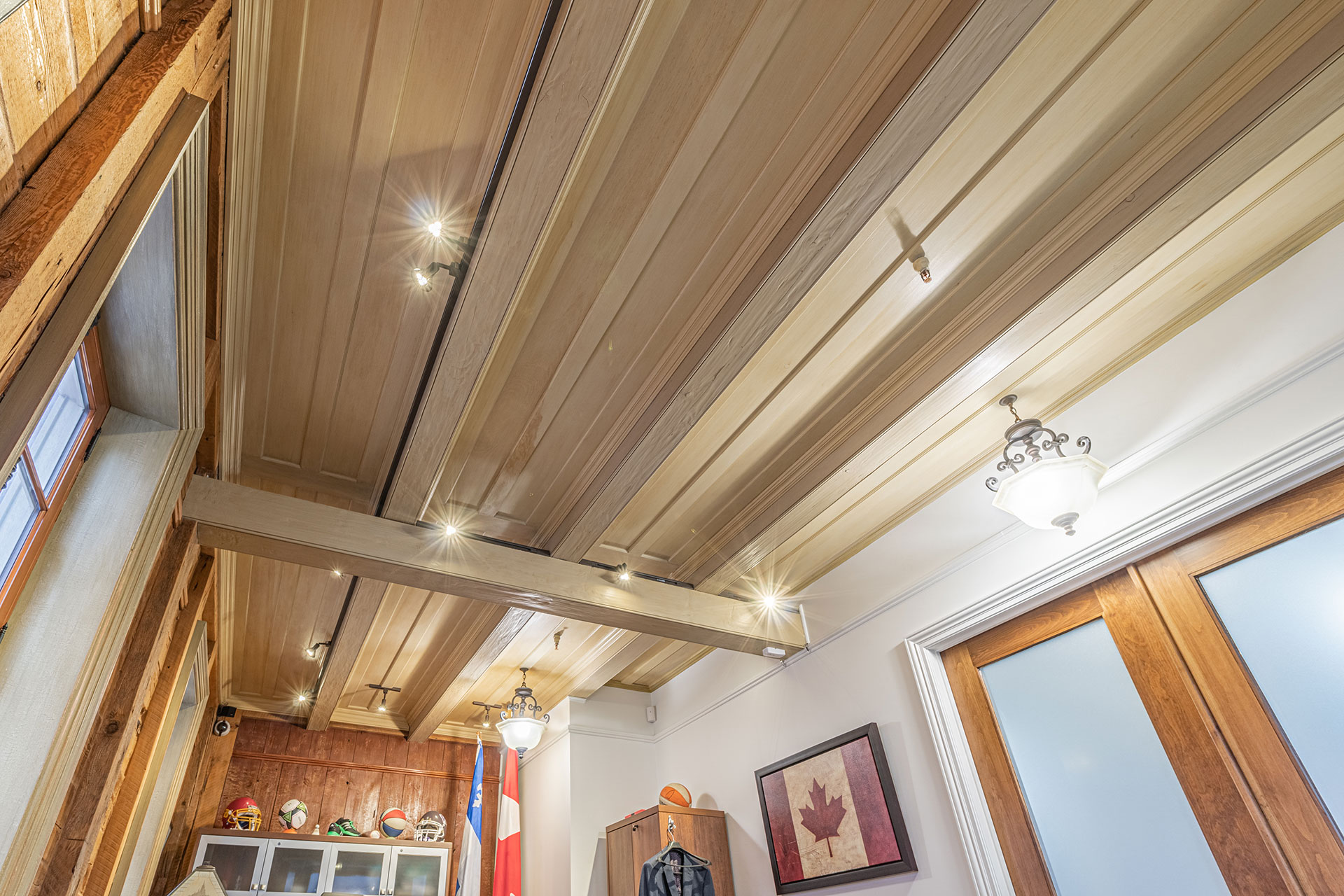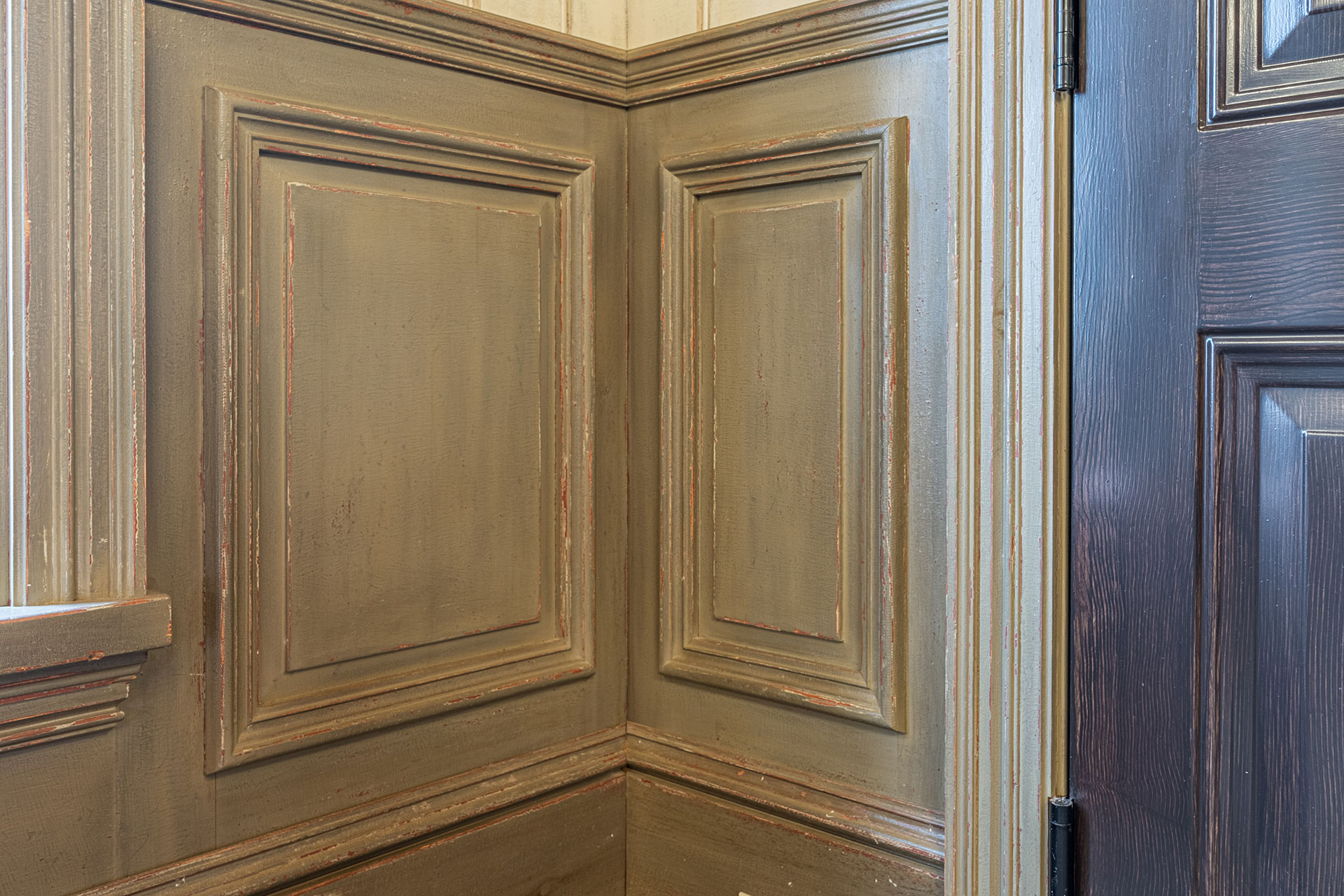 Plafond à caissons fini à la peinture de lait.