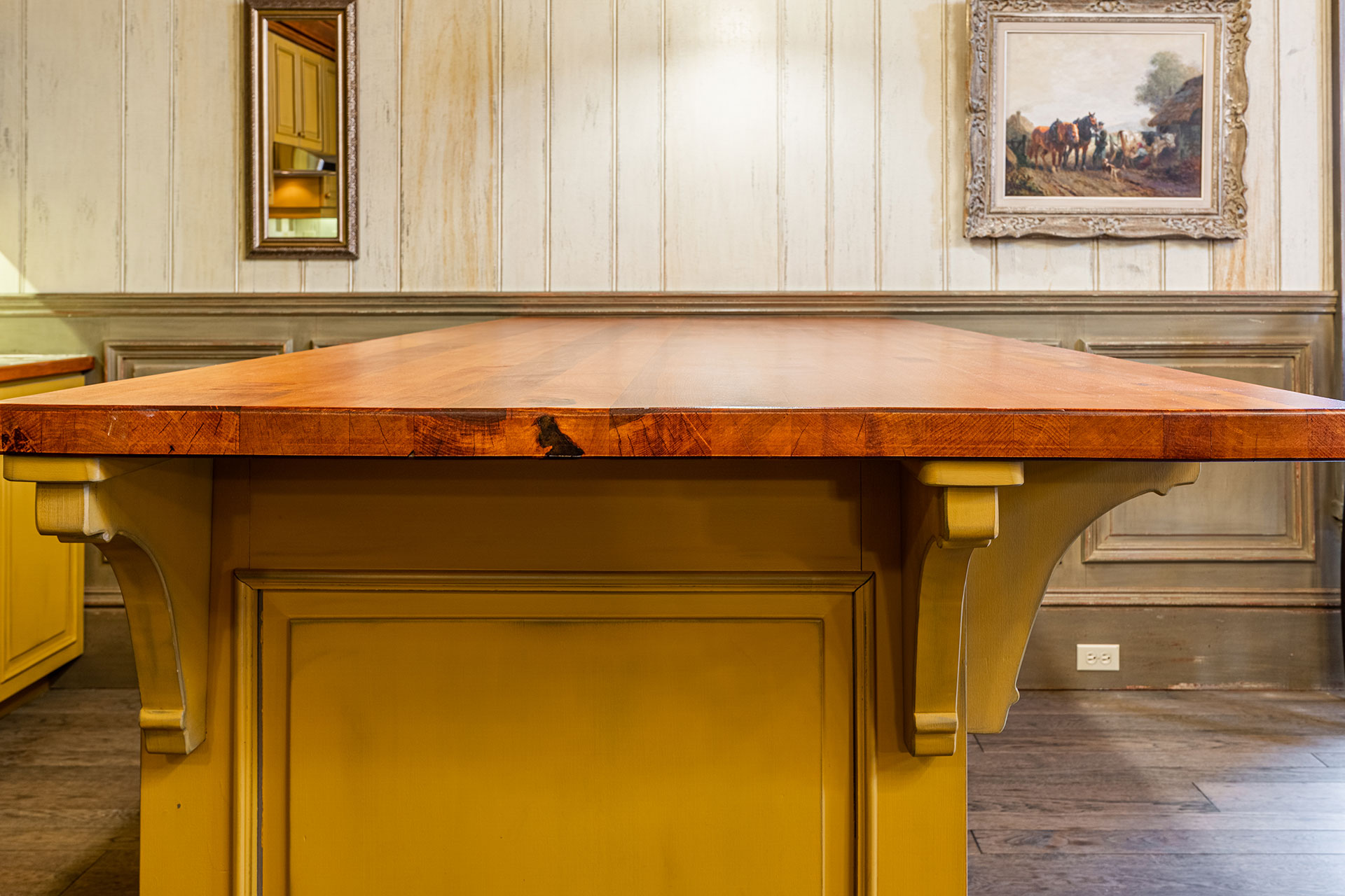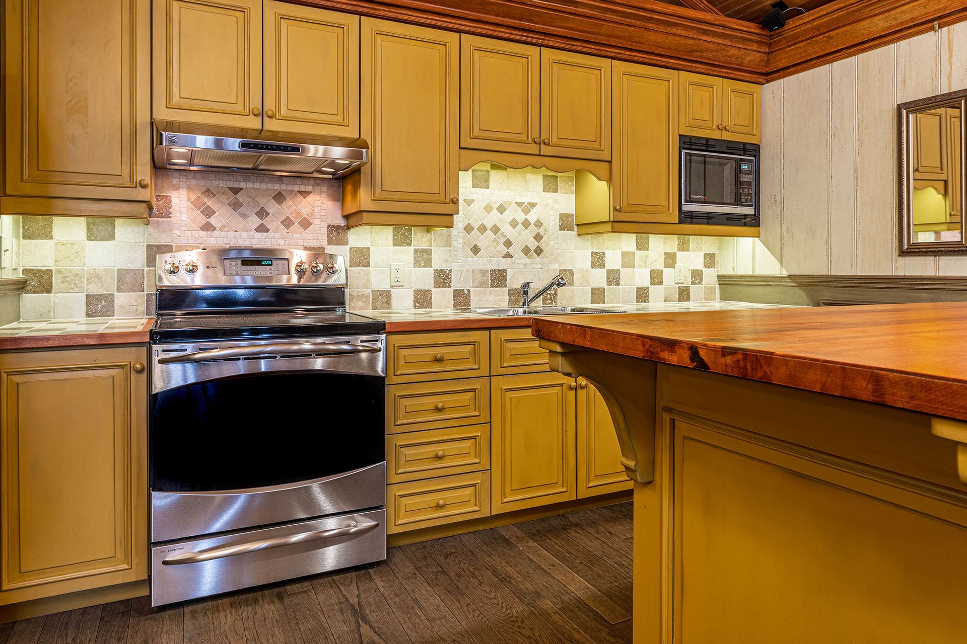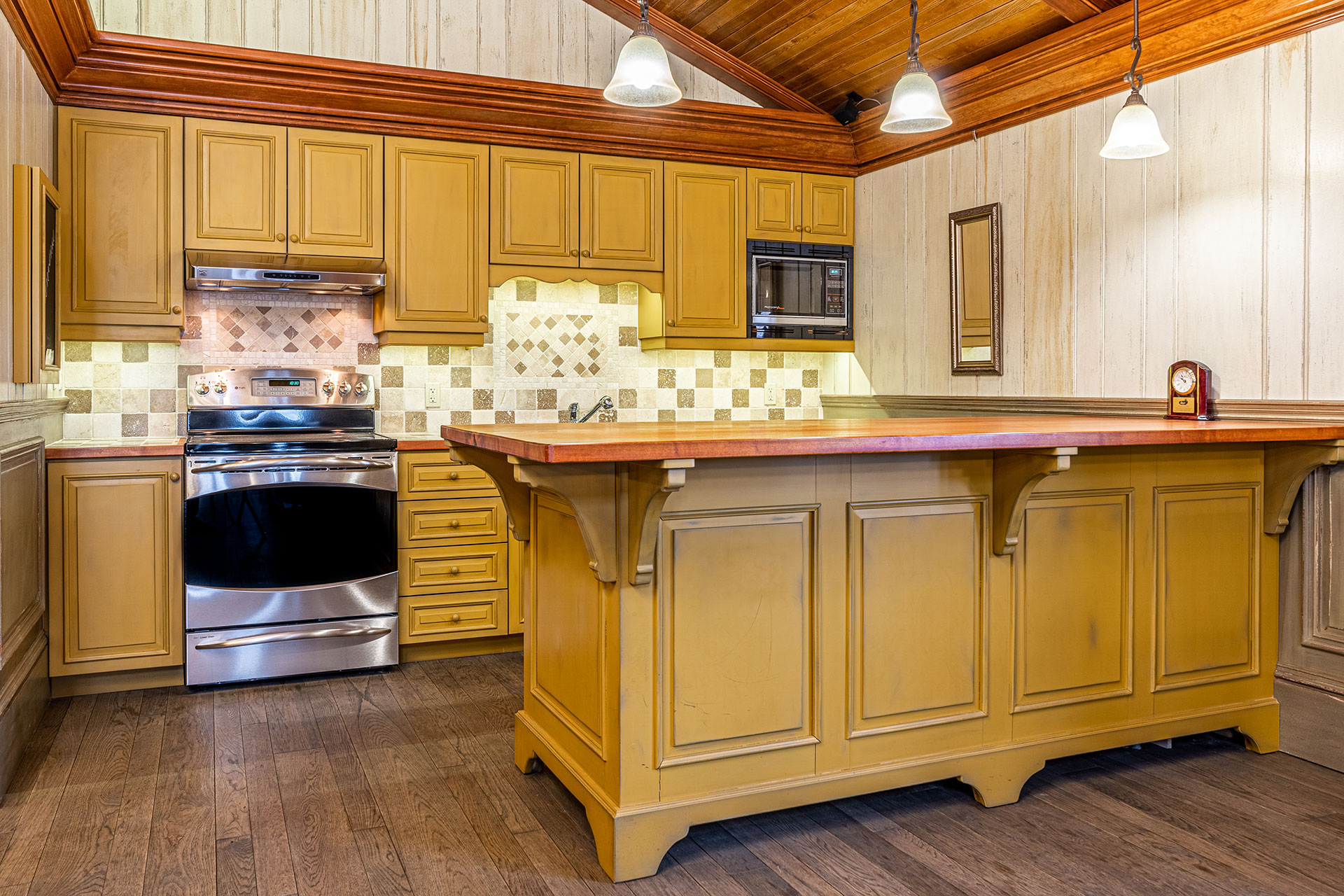 Cuisine en merisier massif – moulures et comptoir finis avec un glacis essuyé.