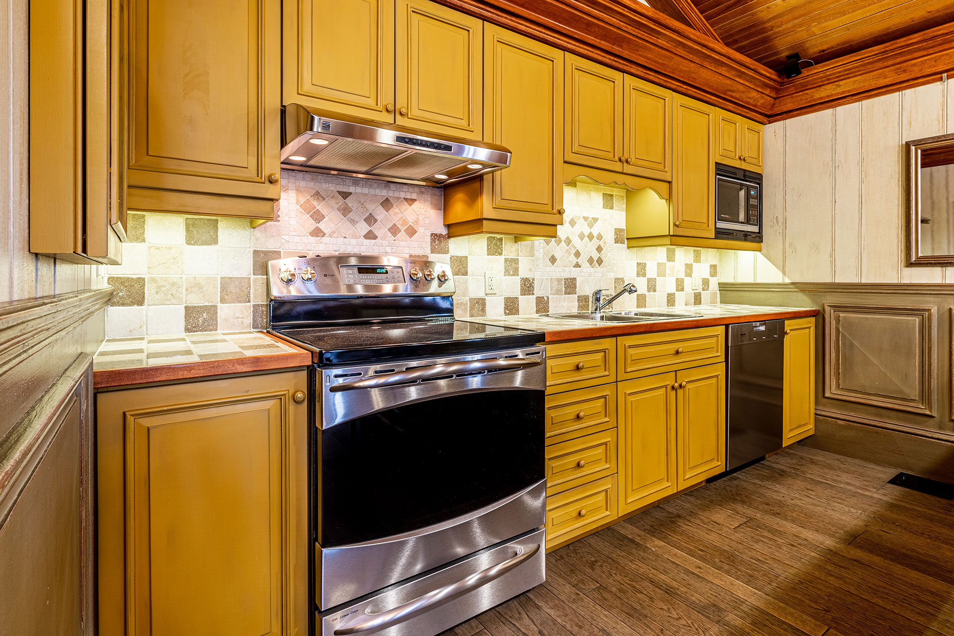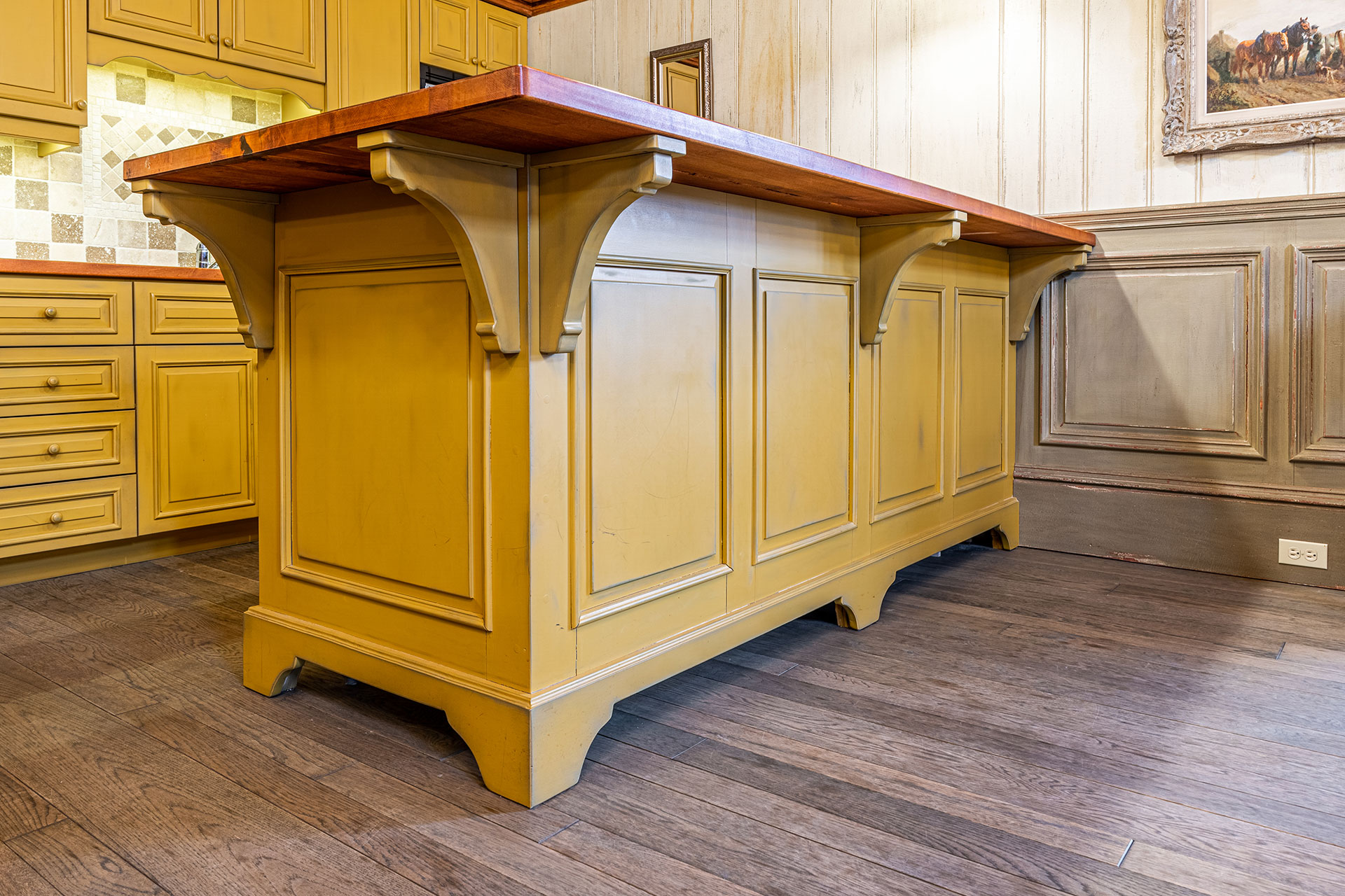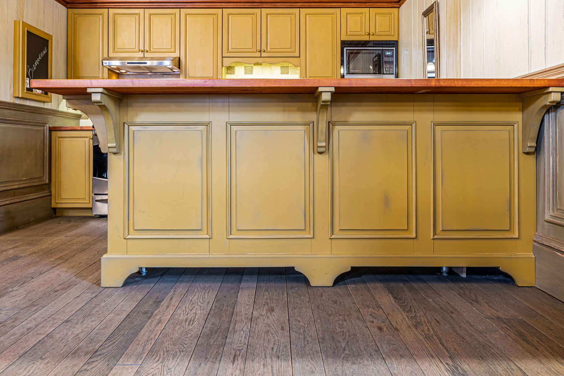 Cuisine en merisier massif – moulures et comptoir finis avec un glacis essuyé.