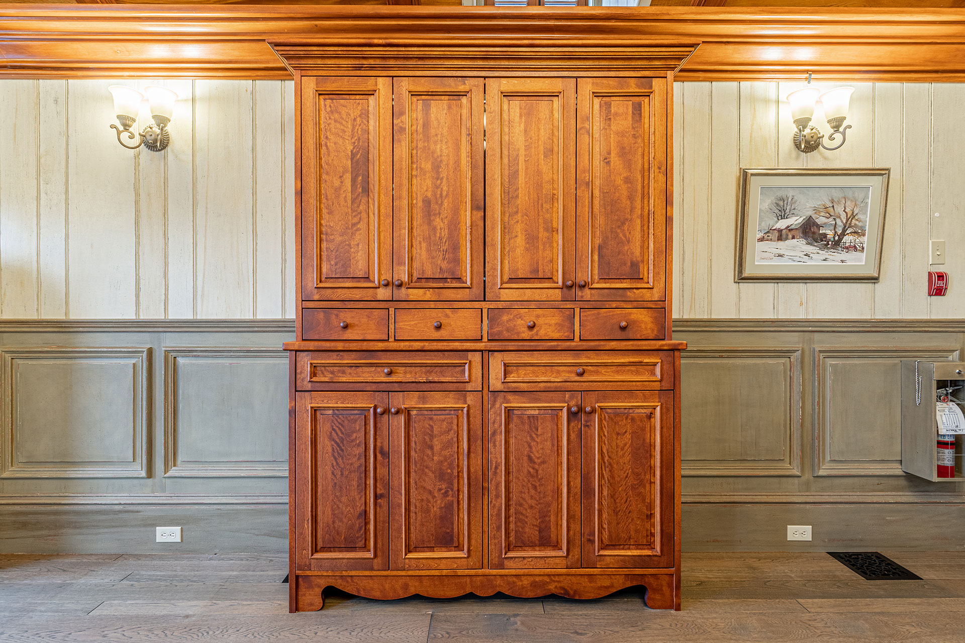 Meuble télé avec espace de rangement en merisier massif teint et vernis pour un commerce de Victoriaville.