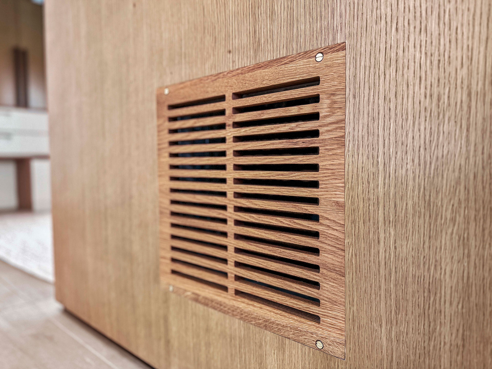 Rangement mural à cloisons fermées en plaqué chêne blanc verni à l’eau avec une coloration légèrement dorée.